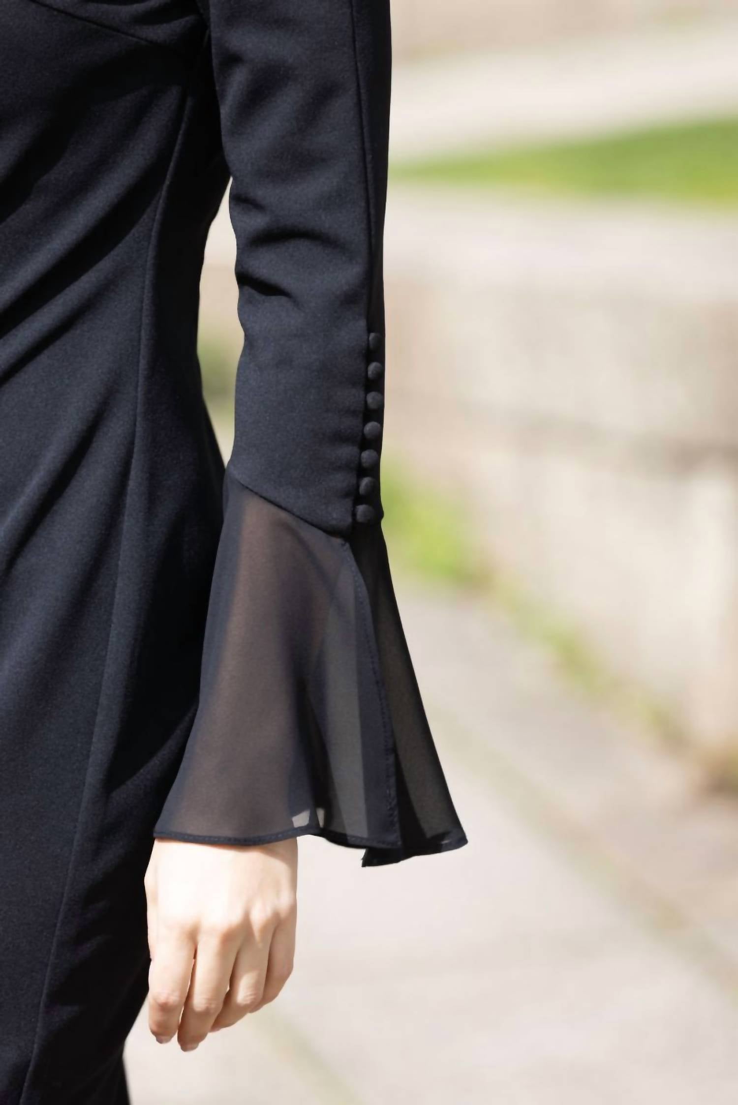 Платье идеальной длины существует. Это элегантное черное платье может похвастаться вырезом-лодочкой, длинными рукавами с добавлением шифона и украшено замысловатой отделкой пуговицами, что добавляет нотку изысканности его вневременному дизайну. Его изящный силуэт легко сочетает современный стиль с классическим очарованием.