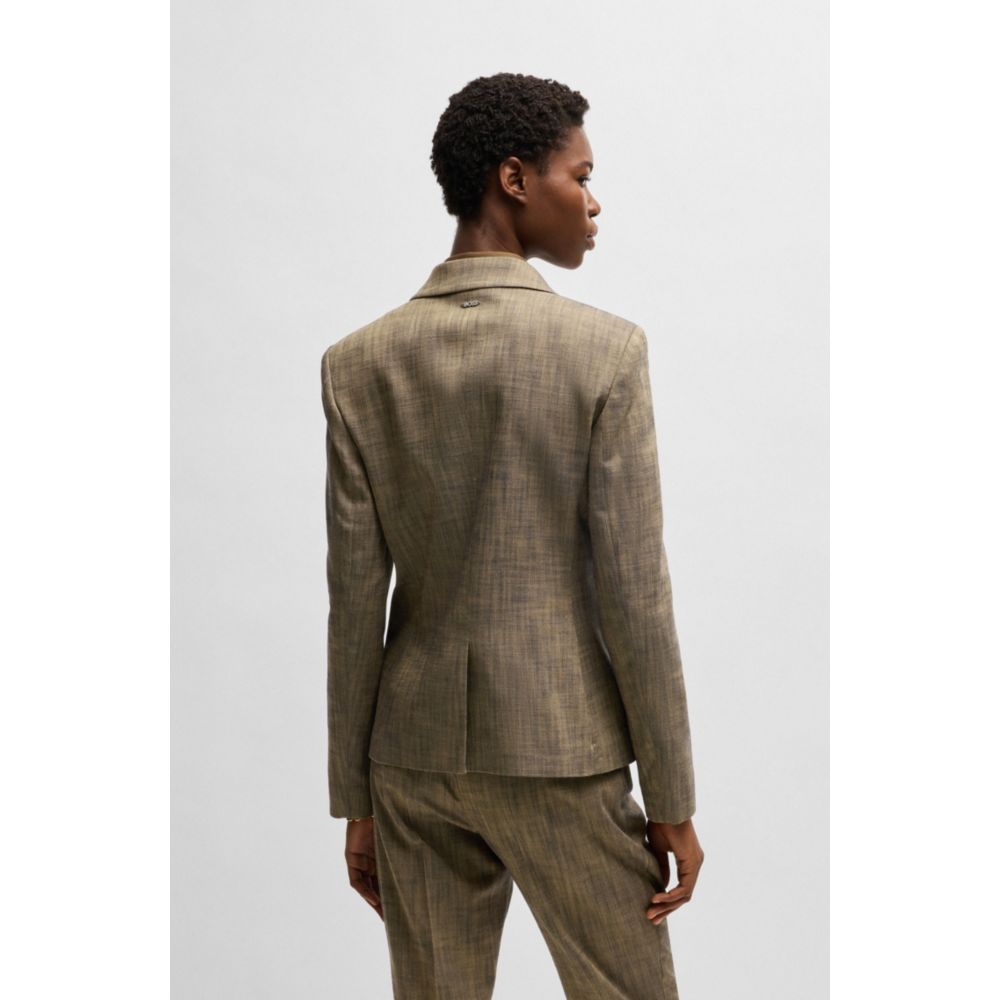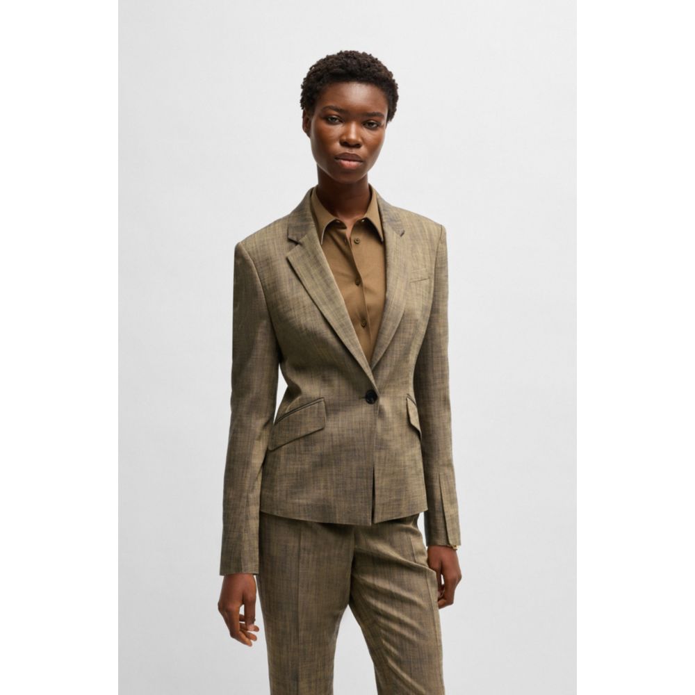 Пиджак на одной пуговице с диагональными карманами от BOSS Womenswear. Этот элегантный пиджак облегающего кроя выполнен из меланжевой ткани «акулья кожа».