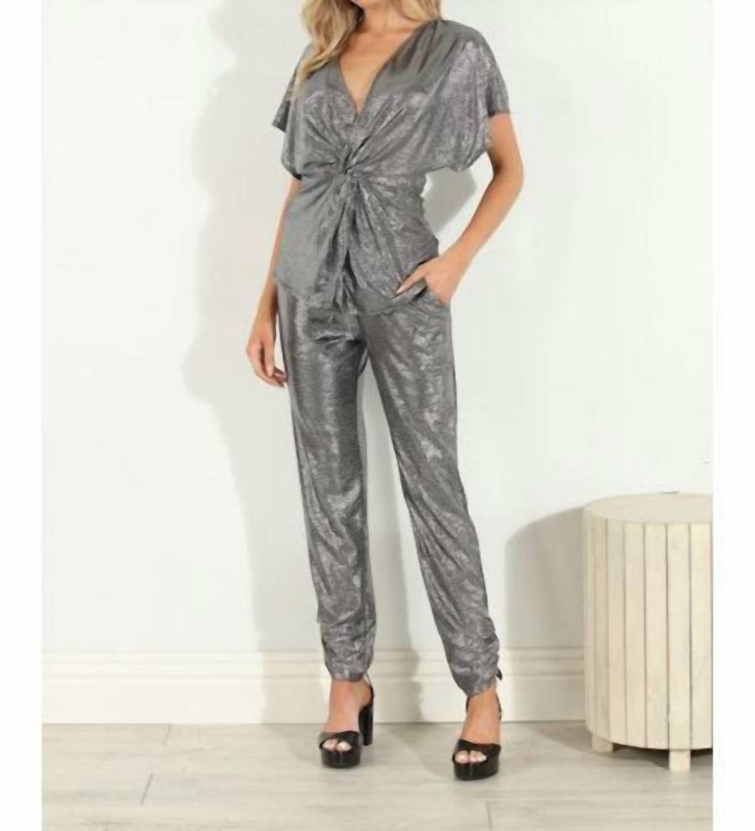 Этот топ с V-образным вырезом, игривым дизайном с поворотом спереди и легкой эластичной тканью одновременно стильный и удобный. Отделка серебряной фольгой.