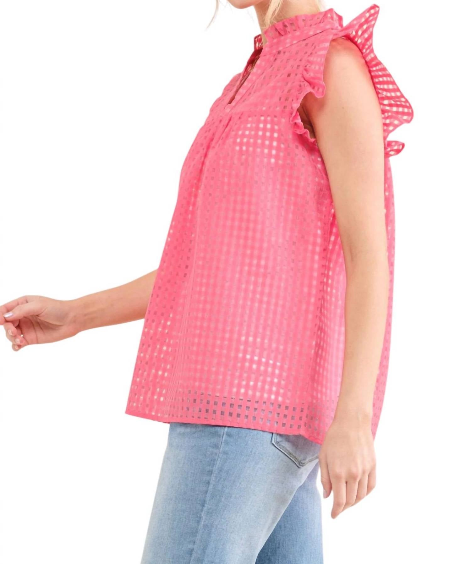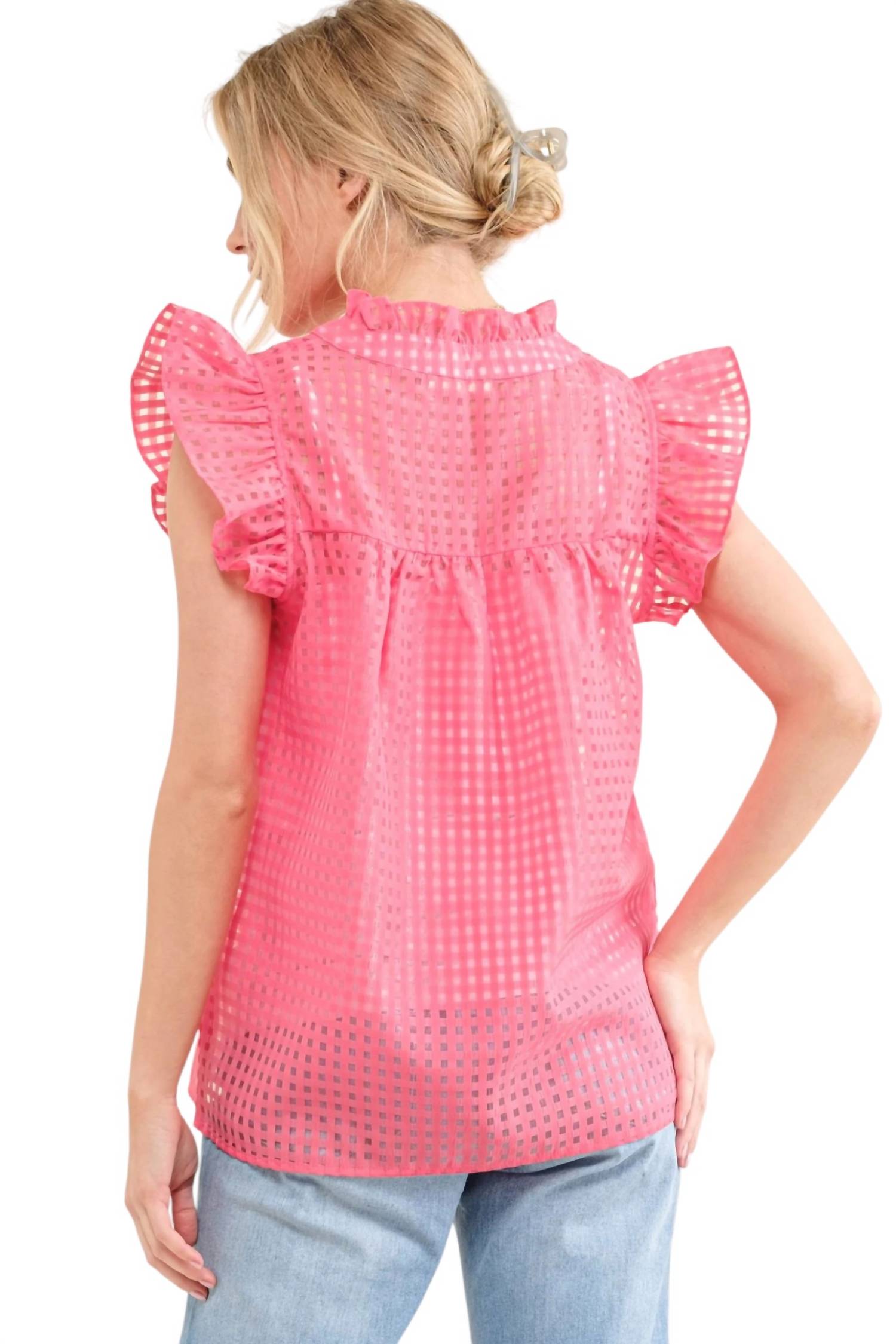 Этот топ сочетает в себе узор в клетку с прозрачной тканью, с лифом на подкладке, рукавами-оборками и свободным кроем. Он изготовлен из 100% полиэстера.
