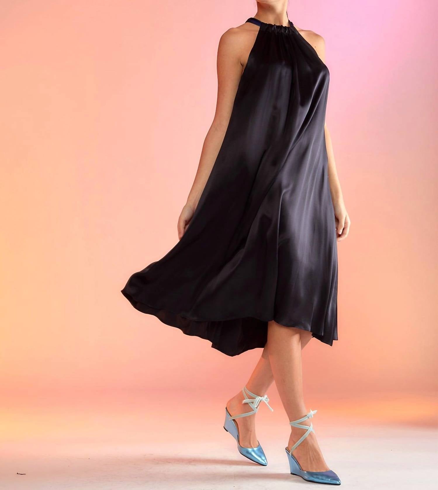 Платье из шелка с халтер-воротом. Регулируемый завязывающийся воротник. Длина миди. Съемный шелковый пояс. Халтер-ворот. Состав ткани - 100% шелк. Инструкции по уходу - только сухая чистка. Крой - рост модели 5 футов 10 дюймов, размер S. Размер S - длина по центру спины - 47 дюймов