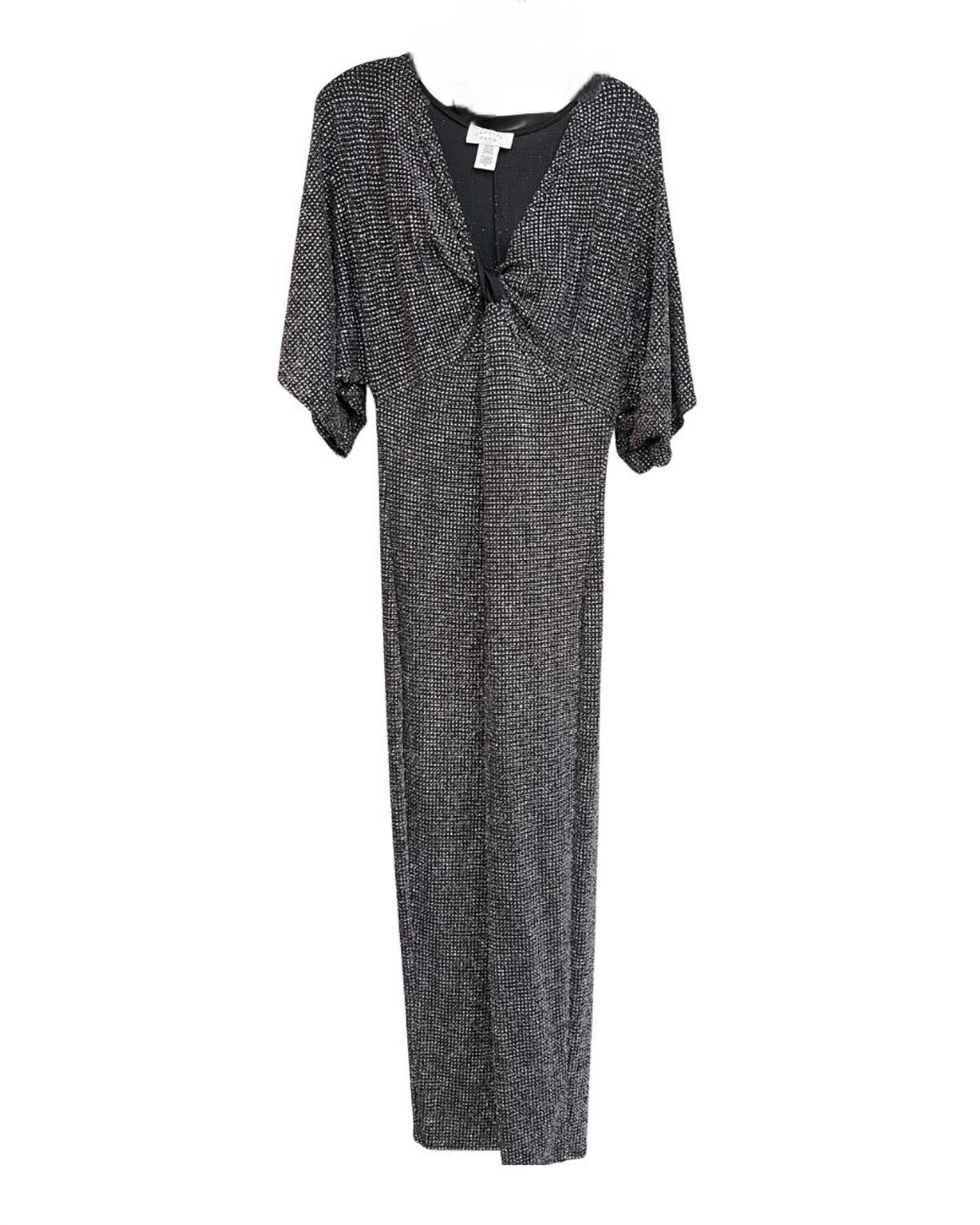 Платье имеет короткие рукава-летучая мышь и вырез-сюрплайз с эффектом обертывания, выполнено из блестящей ткани, которая обеспечивает легкое мерцание. С присборенной талией и драпированными деталями, оно может похвастаться длиной миди и струящимся силуэтом А-силуэта.