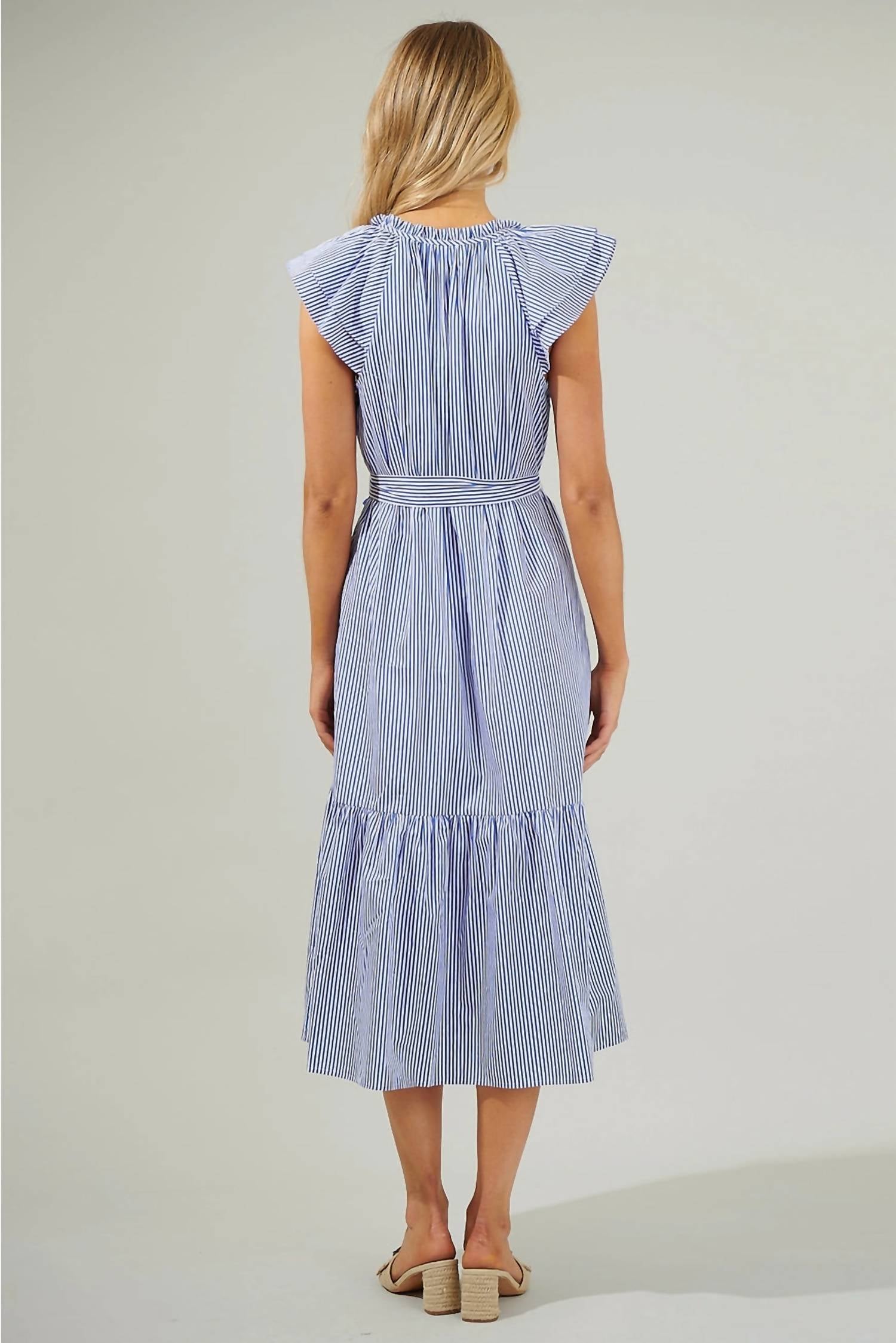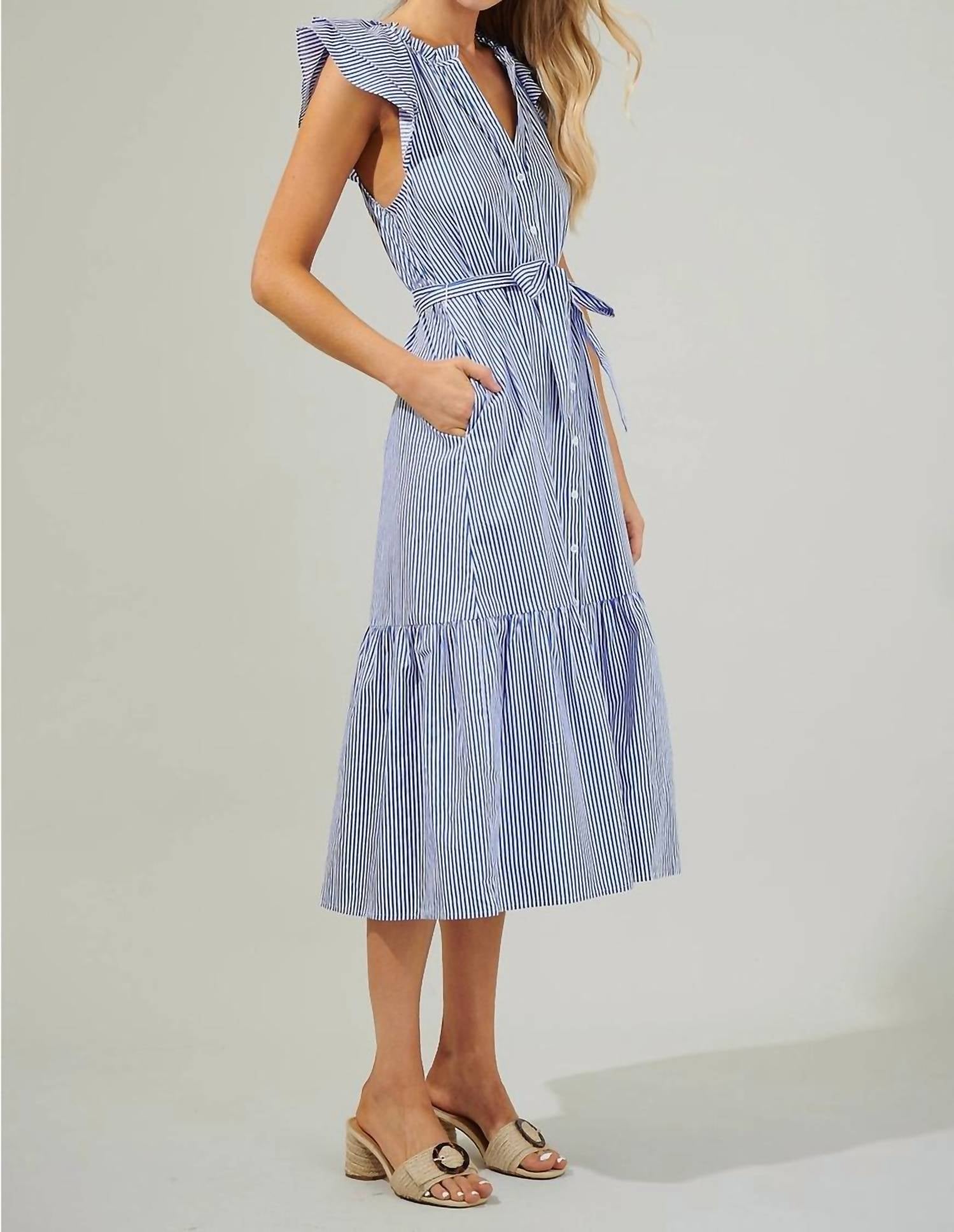 Платье-миди Dynamite Stripped Button с поясом, разрезным V-образным вырезом, короткими рукавами-крылышками и оборками. Включает карманы и застежку на пуговицы спереди. Доступно в сине-белой полоске; модель ростом 5 футов 8 дюймов носит размер XS. Размеры размера S — обхват груди 20 1/4", длина 49 дюймов.
