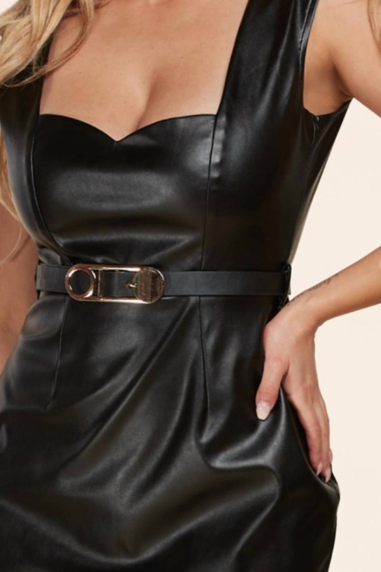 Легкое и привлекательное платье, которое вы будете носить весь сезон. Сексуальное и стильное мини-платье из искусственной черной кожи с толстыми бретелями и вырезом в форме сердечка, который дополняет затянутую талию. Съемный пояс из искусственной кожи в тон делает акцент на абстрактной пряжке золотистого тона. Подкладка Пришитые шлевки для ремня Открытая молния золотистого тона сзади