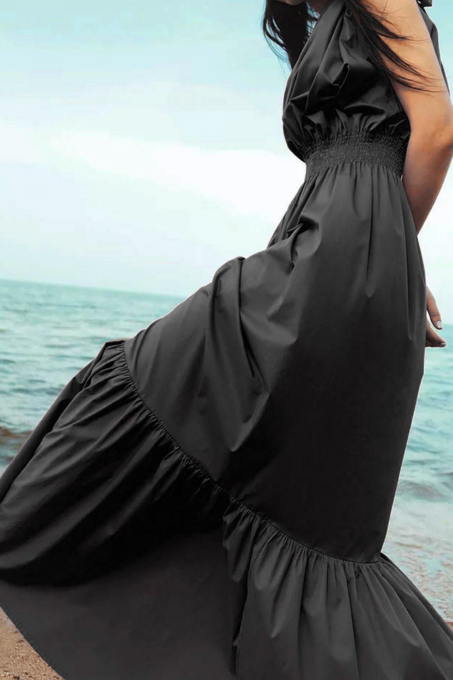 Платье Monica Nera Demi Maxi. Изготовленное из высококачественного и экологически сертифицированного хлопка, Demi — это нежное платье с асимметричным халтер-воротником и стильным кроем. Высокий эластичный пояс создает классический силуэт А-силуэта, приподнимая ткань вверх по груди и вниз к ногам.