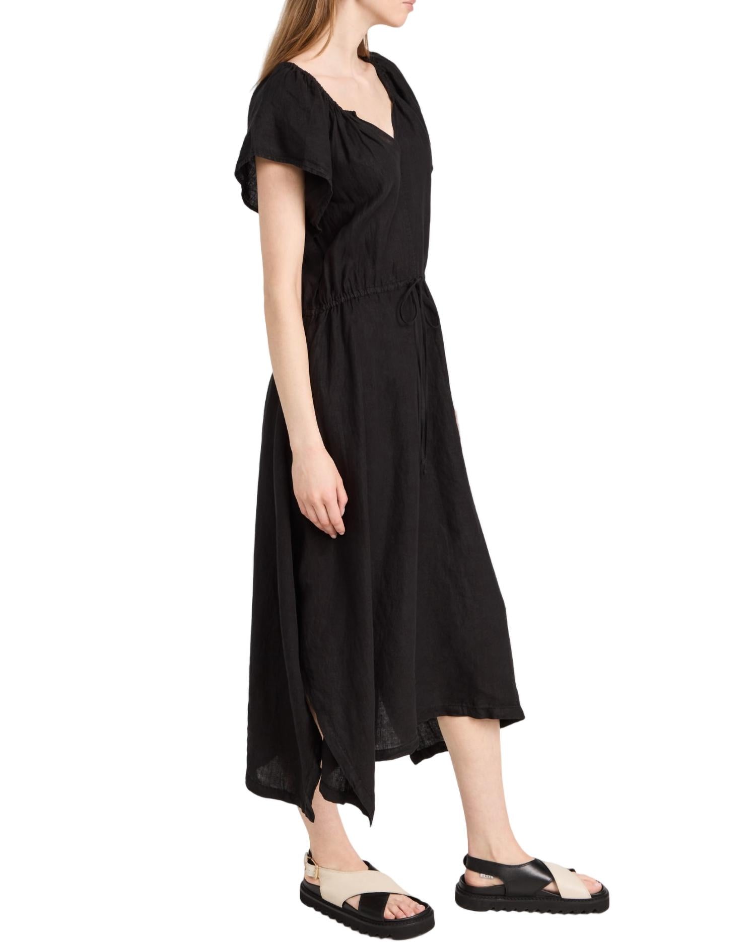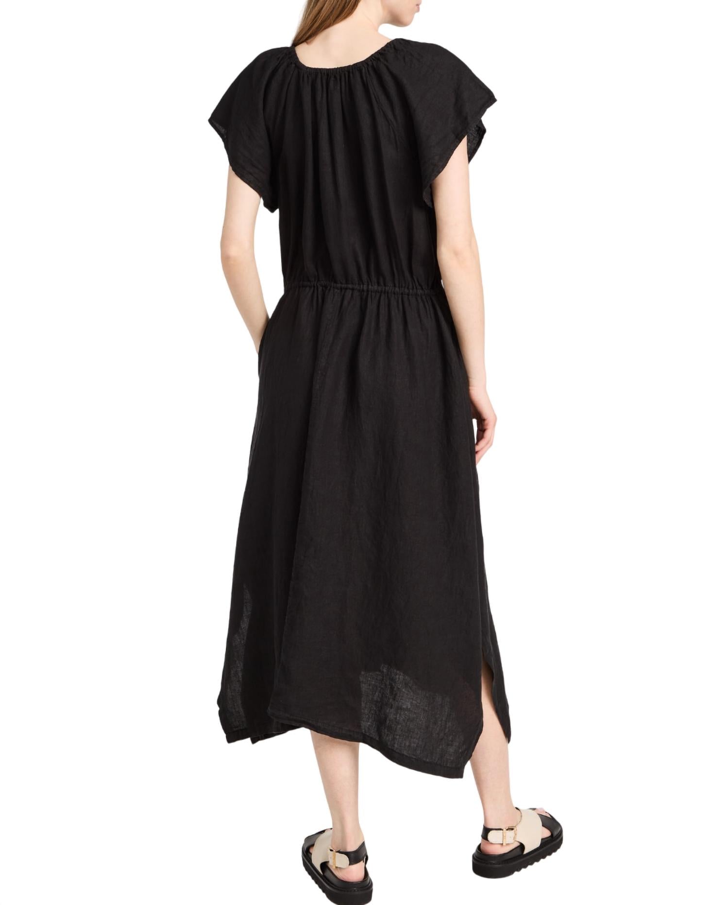 Платье миди настолько универсально, что ваши варианты ношения безграничны. Легкая, неэластичная льняная ткань. Эластичный V-образный вырез. Пояс на шнурке. Рукава-бабочки. Карманы в швах на бедрах. Верх - 100% лен. Стирать в холодной воде. Сделано в США. Мерки для размера S - Длина - 47,25 дюйма / 120,0 см от плеча.