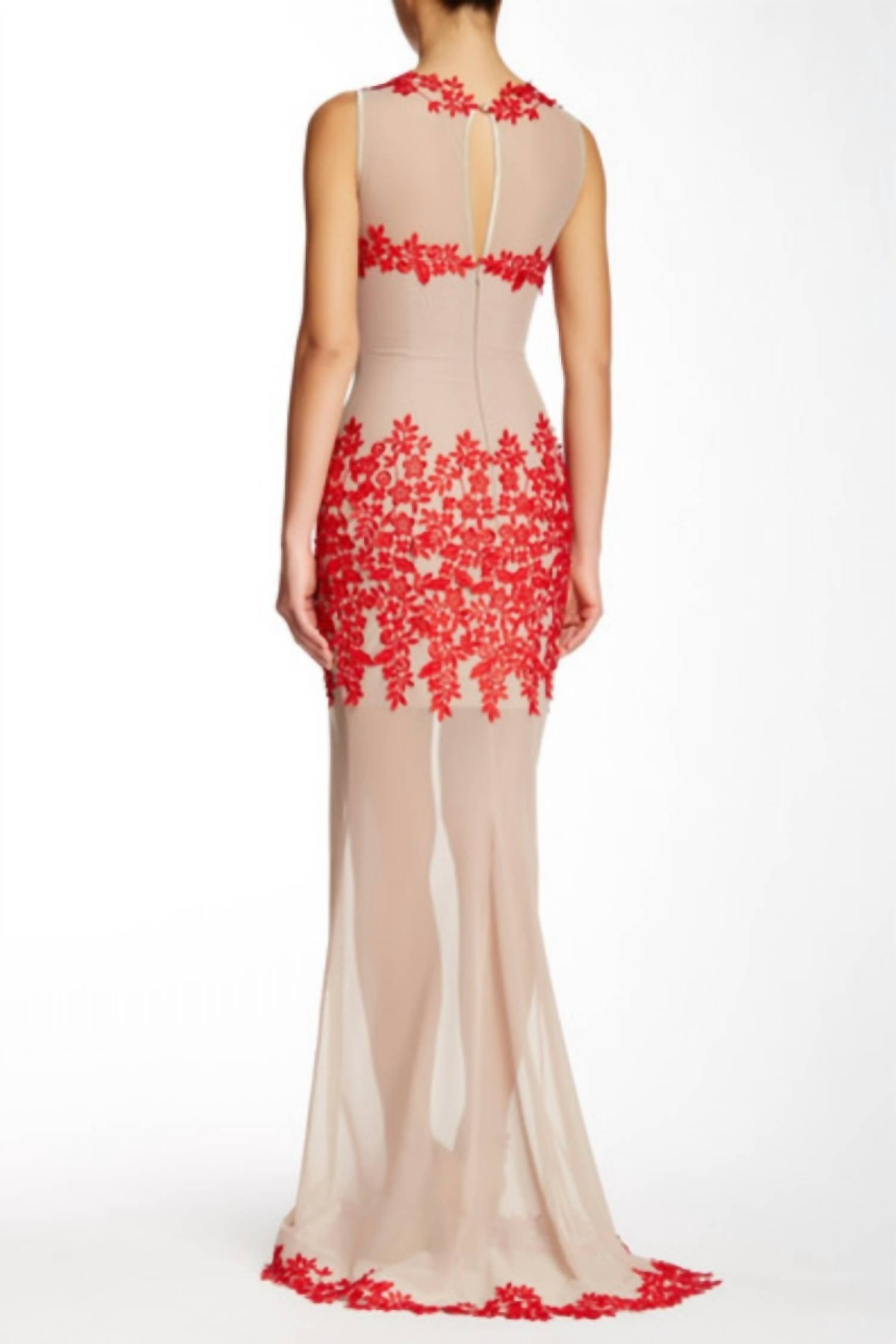 Платье макси, которое одновременно мило и удобно. Потрясающее платье с красным цветочным декором и платьем-иллюзией телесного/бежевого цвета.