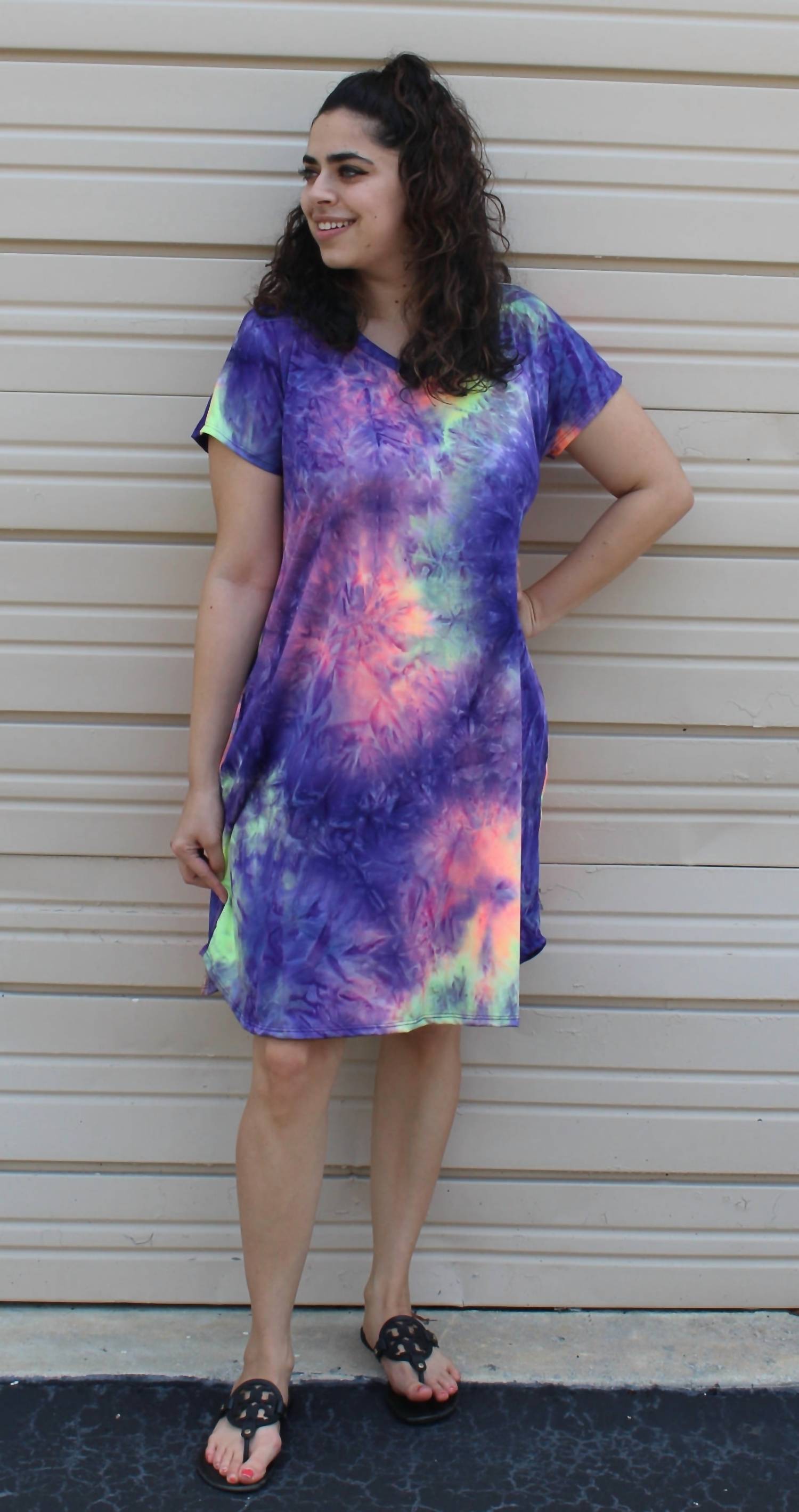 Он очень мягкий, легкий и очень удобный. Принт тай-дай просто потрясающий! Он имеет V-образный вырез, короткие рукава, карманы по бокам и А-силуэт. 1XL Бюст 44" Длина 38", 2XL Бюст 46" Длина 38", 3XL Бюст 48" Длина 38". 95% полиэстер, 5% спандекс. Ручная стирка в холодной воде или химчистка.