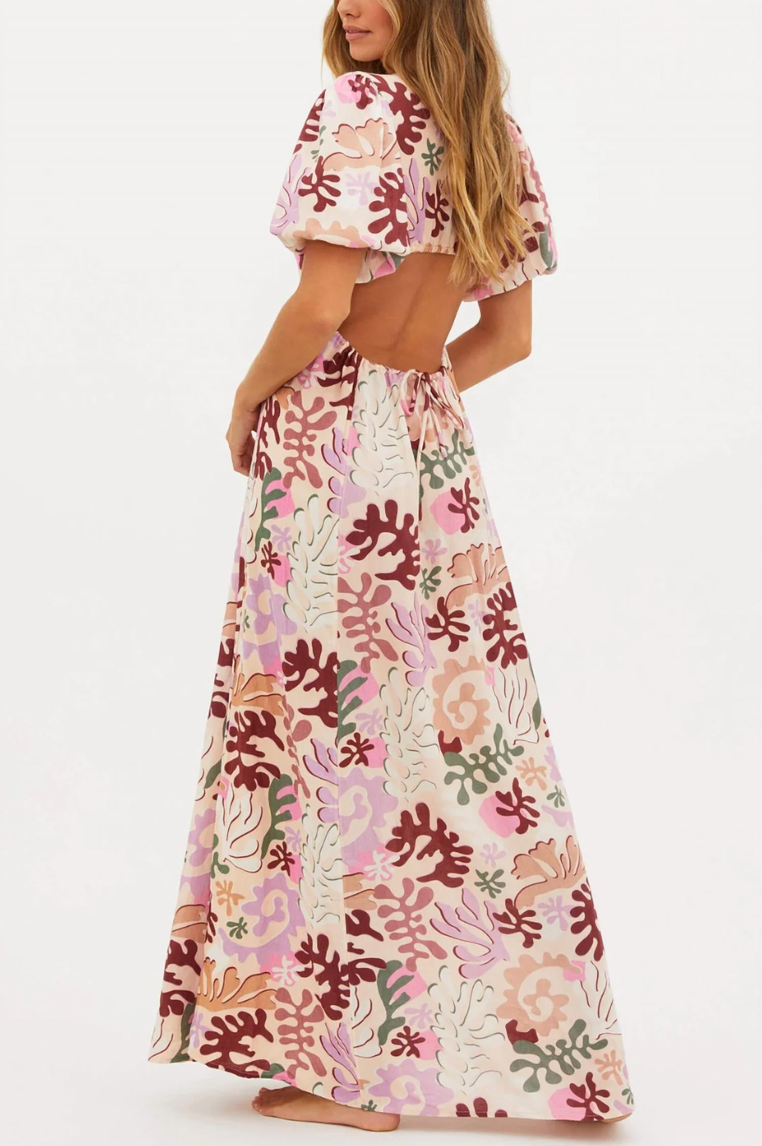 Короткие рукава-фонарики и вырез на спине с регулируемым шнурком для утягивания талии. На модели размер Small.