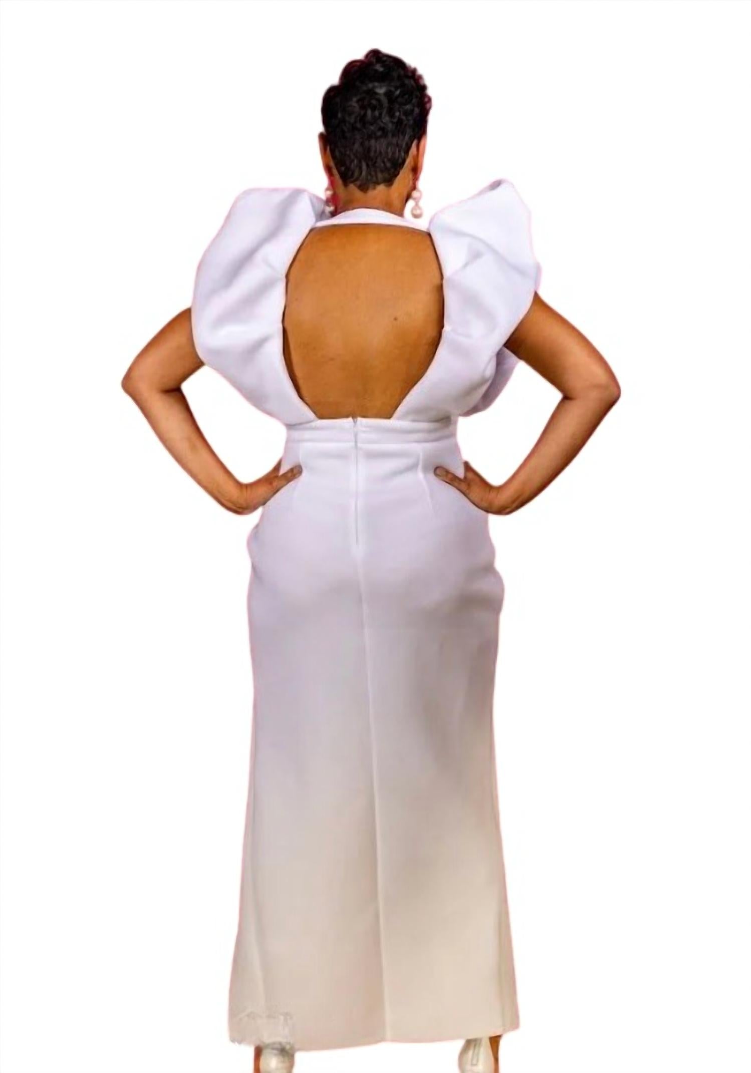 Это белое платье-футляр с драматичными рукавами-крылышками и глубоким V-образным вырезом, создающим эффектный силуэт. Талия с поясом и асимметричный разрез открывают бедра в нужном объеме, а открытая спина с верхней лямкой, застежка-молния сзади, разработанная для точной подгонки по размеру.