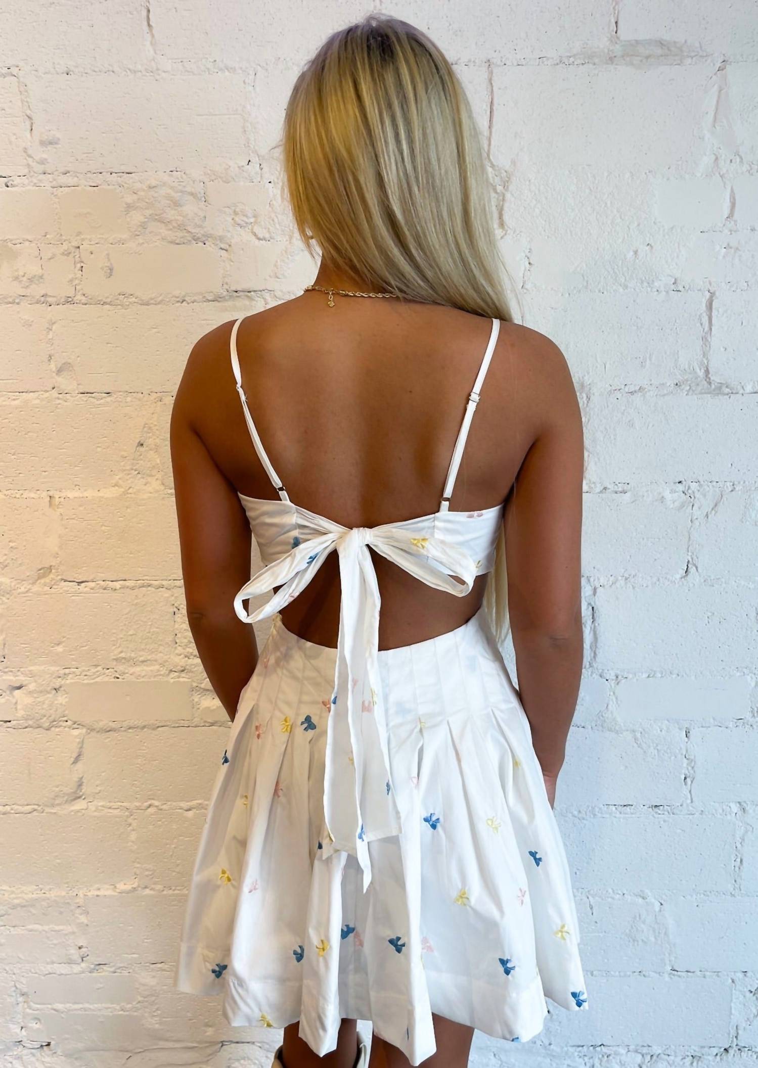 Платье бэби-долл с открытой спиной. Вышитый принт с бантом. Плиссированный корсетный торс. Регулируемые бретельки-спагетти. Завязывающийся сзади бант. Застежка-молния сбоку. Платье полностью на подкладке. 100% вискоза.