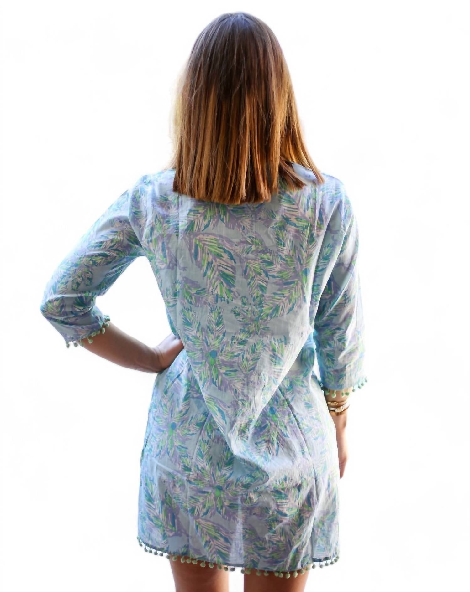 Вам захочется взять это с собой в следующий отпуск! Платье-накидка с узорами из пальмовых листьев в оттенках зеленого лайма и синего. Оно имеет рукава три четверти, украшенные помпоном на манжетах и ​​подоле, что добавляет игривости его дизайну. Платье имеет два нижних боковых разреза для удобства движения и комфорта. Изготовлено из 100% хлопка, обеспечивает тонкое и легкое ощущение.