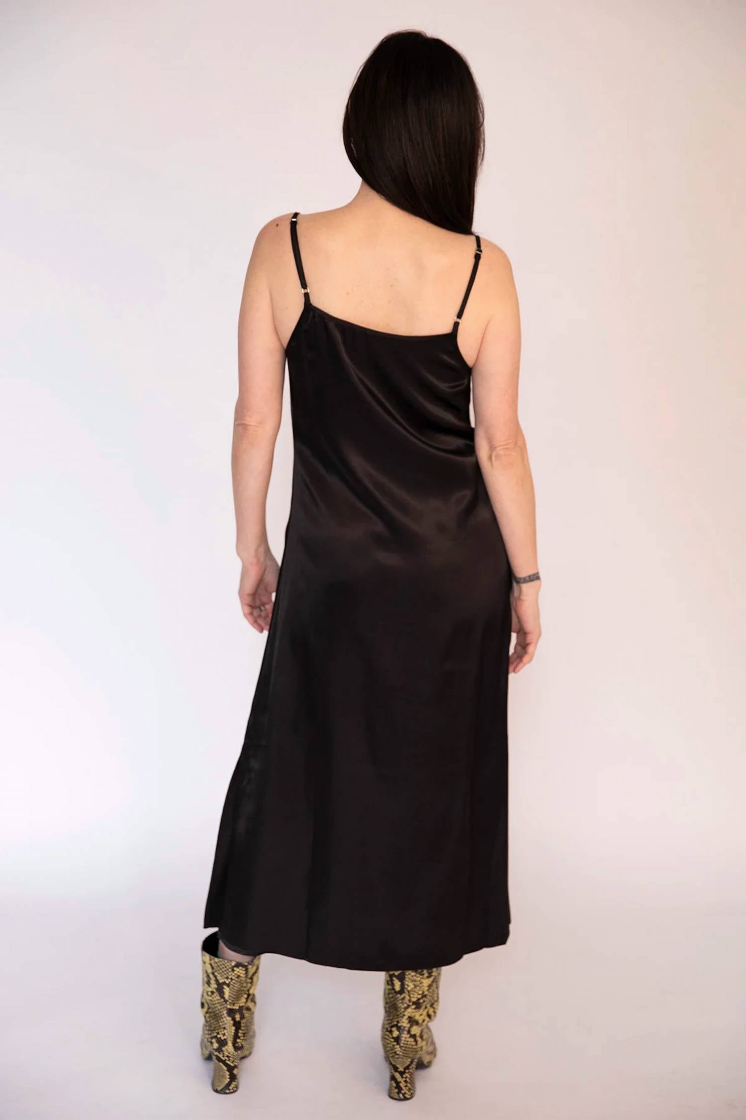 Платье-комбинация Soho — это потрясающее атласное платье миди с блестящей отделкой. Оно имеет тонкие узкие бретели и привлекательную V-образную вставку с присборенной отделкой на груди. 100%-ный устойчивый модальный атлас.