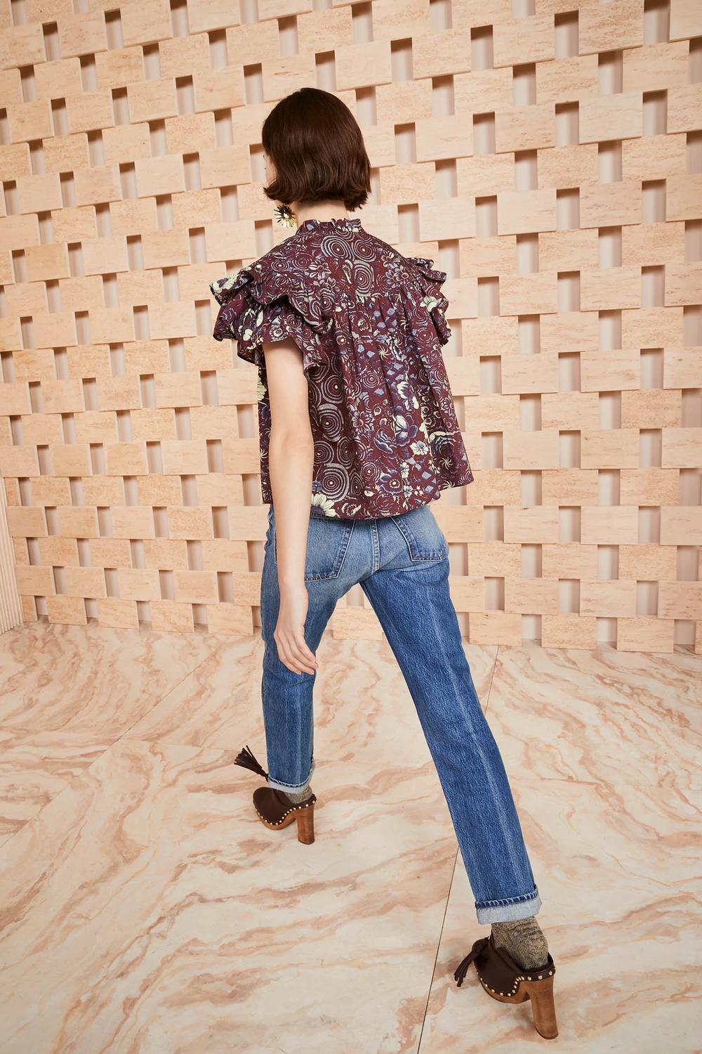 100% хлопок. Топ Letty Top — классический Ulla Johnson с преувеличенными оборками на рукавах. Этот топ завязывается сверху и имеет складки спереди. Принт гелиотропа имеет великолепную темно-бордовую основу с синим и кремовым цветочным + абстрактным принтом. Свободный силуэт. Многослойные рукава-крылышки.