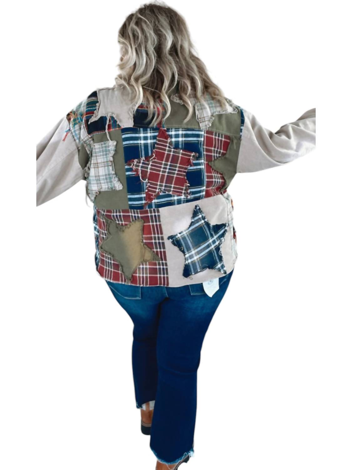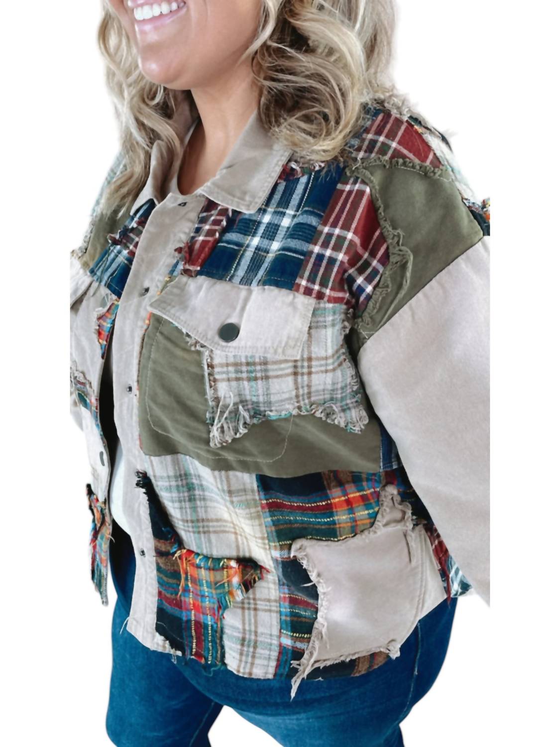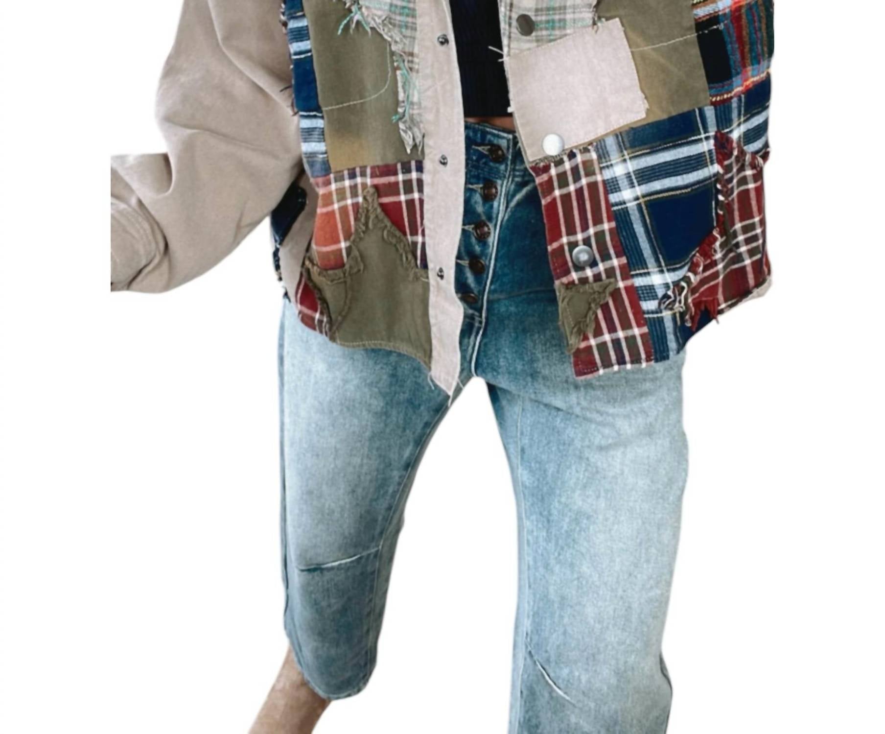 Куртка-пуховик Care Free Plaid Patch Button Down от Oli & Hali Куртка цвета хаки с длинными рукавами Уникальный клетчатый пэчворк Стильная яркость Повседневный наряд 100% хлопок Свободный крой Комфорт и прочность Застежка на пуговицы Воротник-стойка Сушить в горизонтальном положении