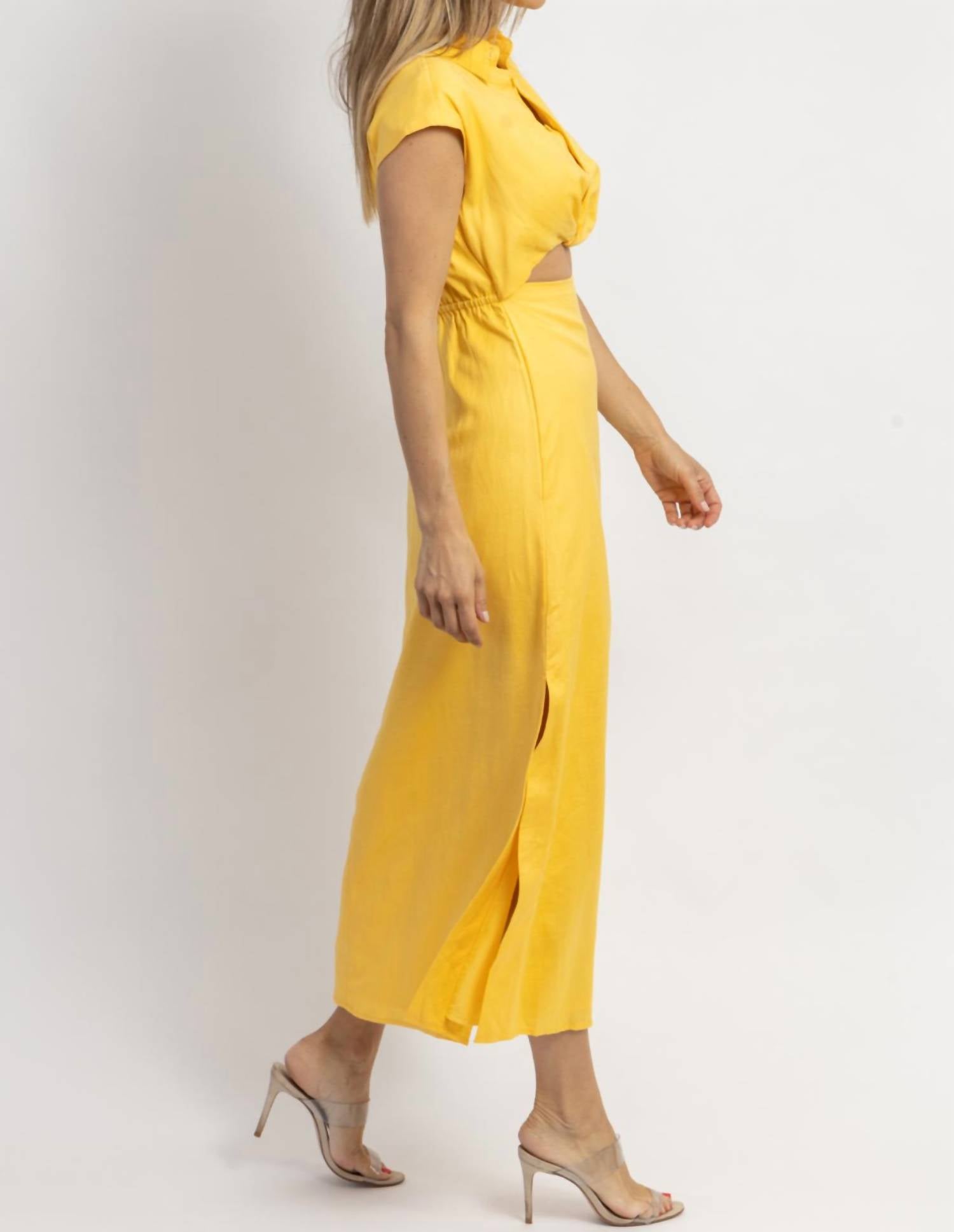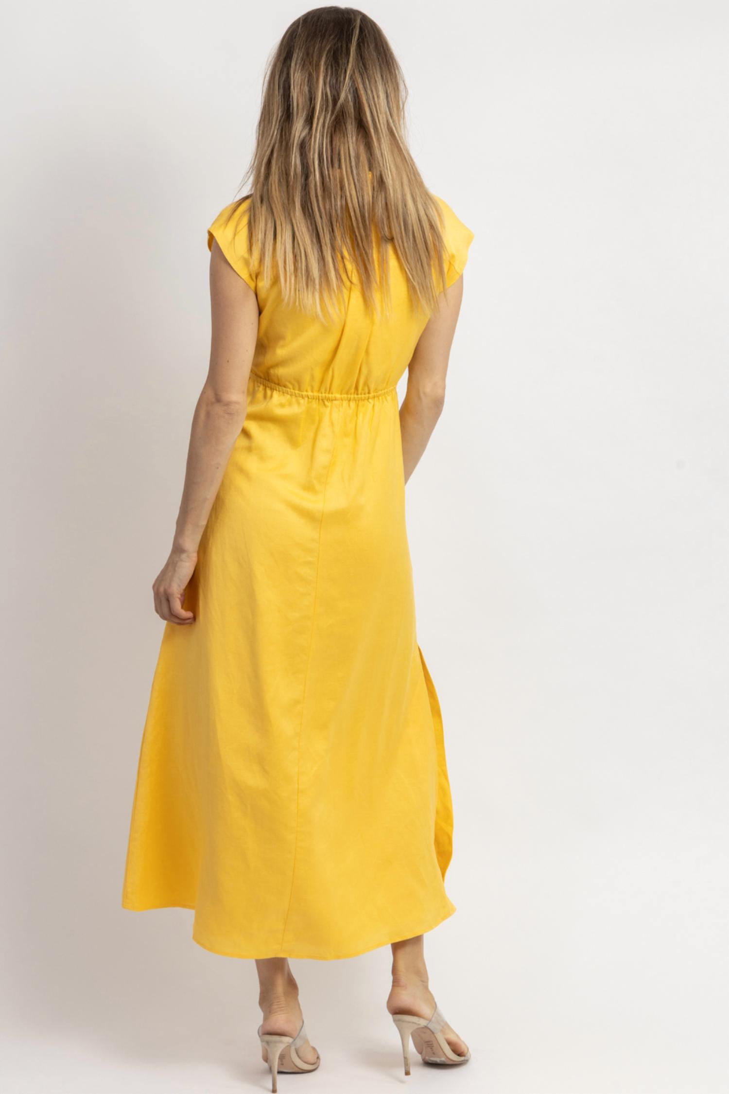 Полностью на подкладке, длина миди, застежка на пуговицы спереди, открытая передняя деталь, боковой карман, эластичная спинка, воротник, разрез сбоку. 55% лен, 45% вискоза. На модели размер small. Рост 5'8. Размер платья 2.