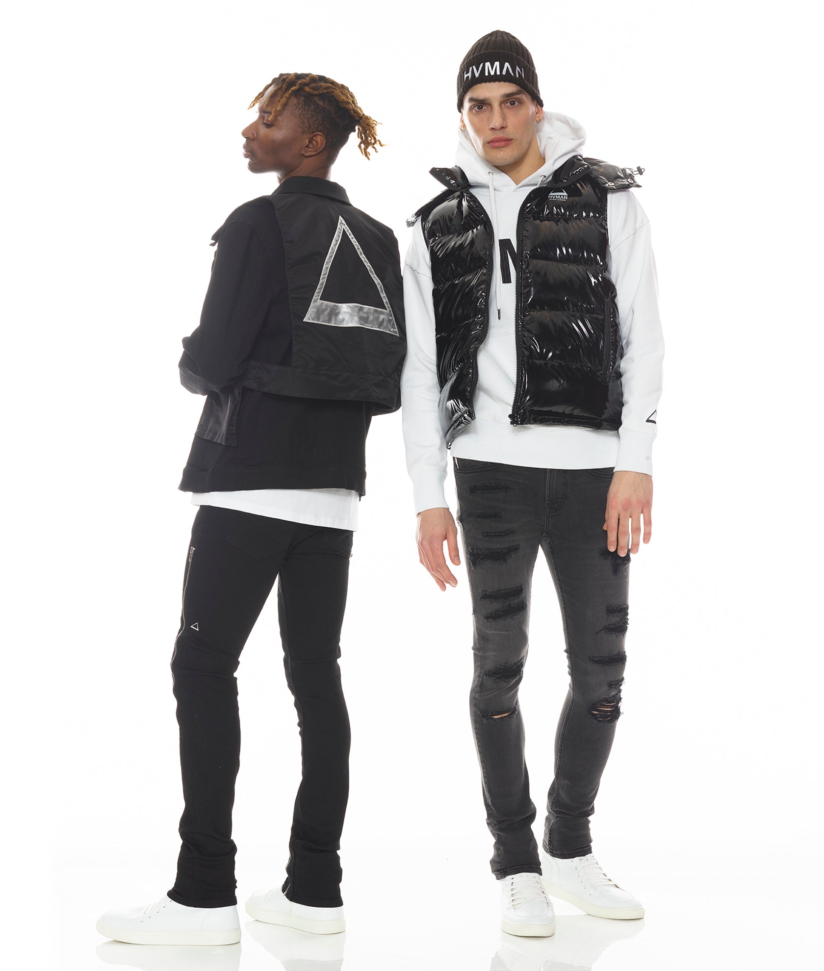 Эта блестящая черная нейлоновая куртка — идеальный многослойный предмет. Куртка имеет треугольный логотип HVMAN, напечатанный спереди, и увеличенный логотип, напечатанный сзади. - Полная застежка-молния- 2 кармана на молнии