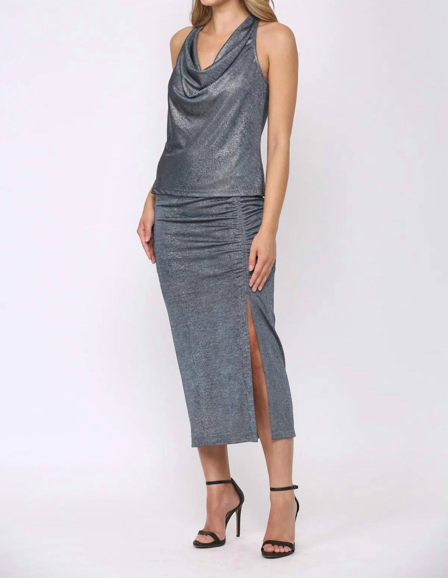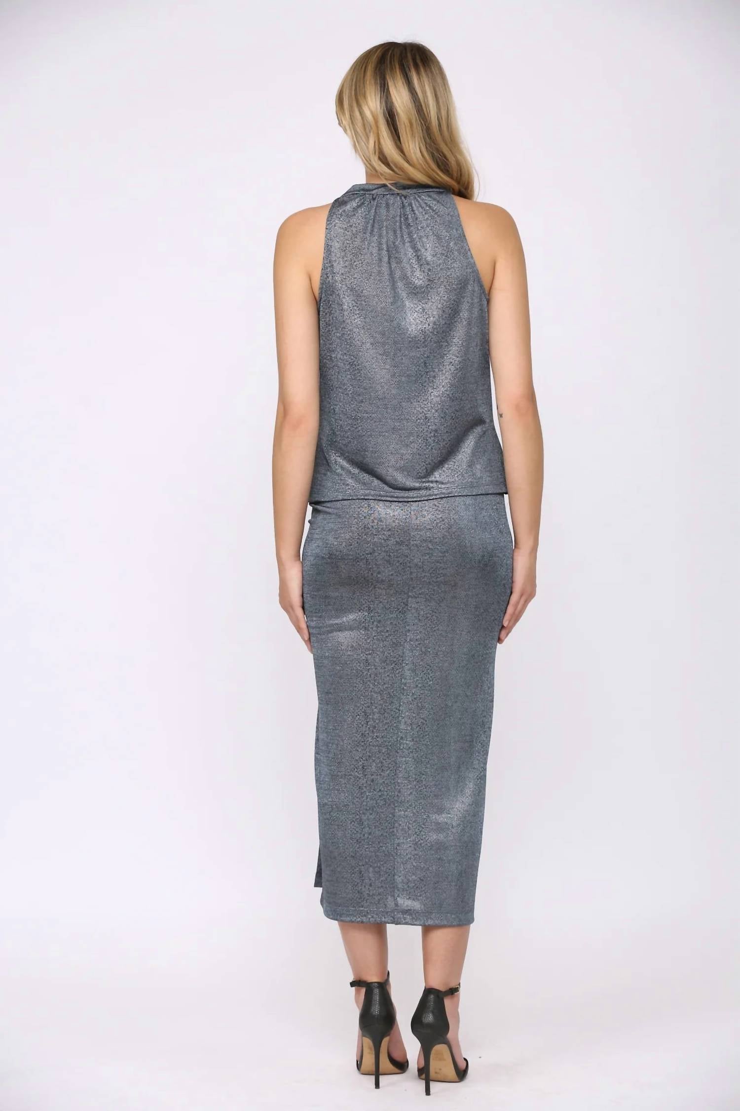 Принт под змею. Металлический оттенок. Вырез-хомут. Без рукавов. Длина миди. 100% полиэстер. Сделано в США.