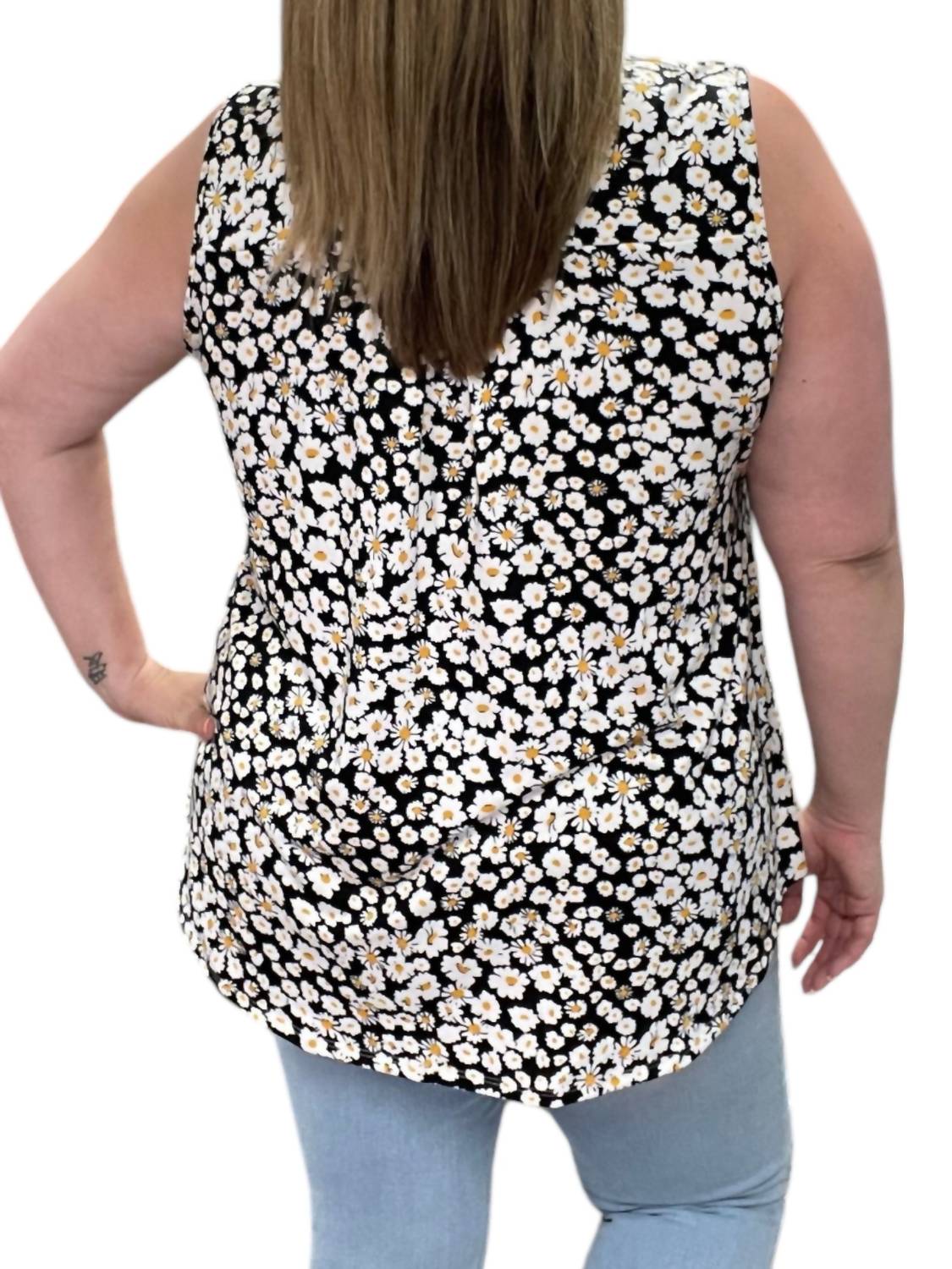 Без рукавов. Надевается через голову. Цветочный принт. V-образный вырез. 100% хлопок. Машинная стирка в холодной воде.