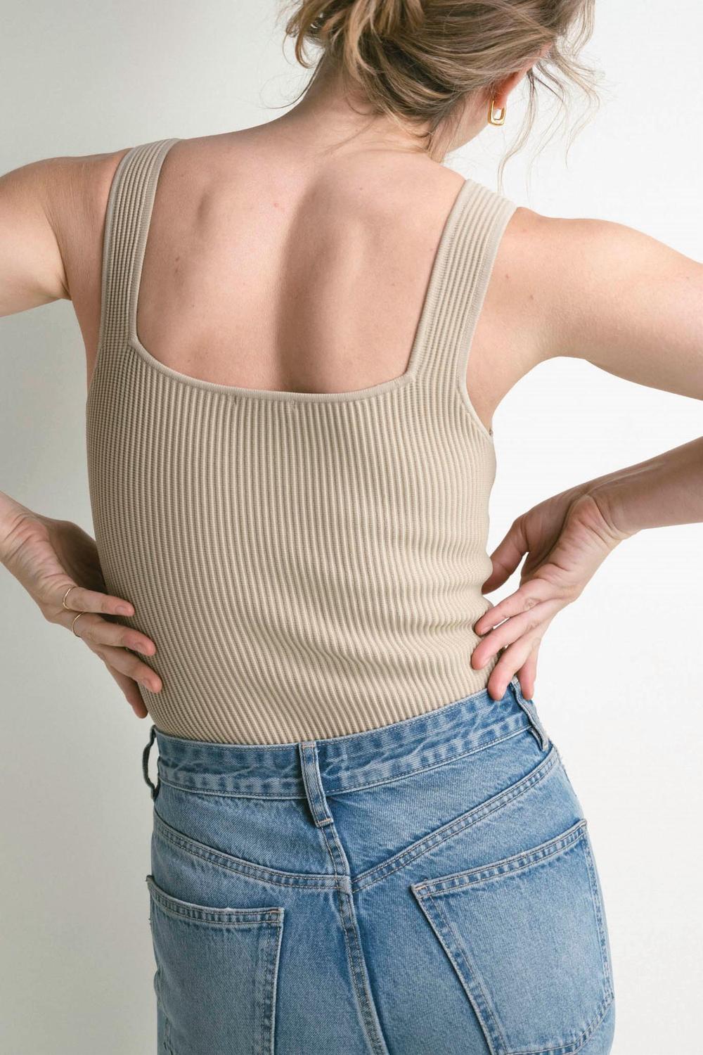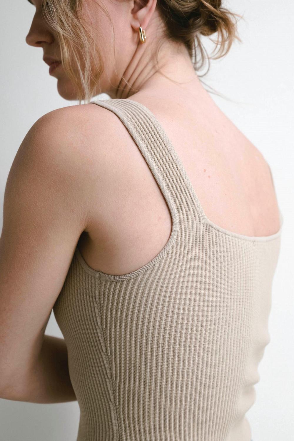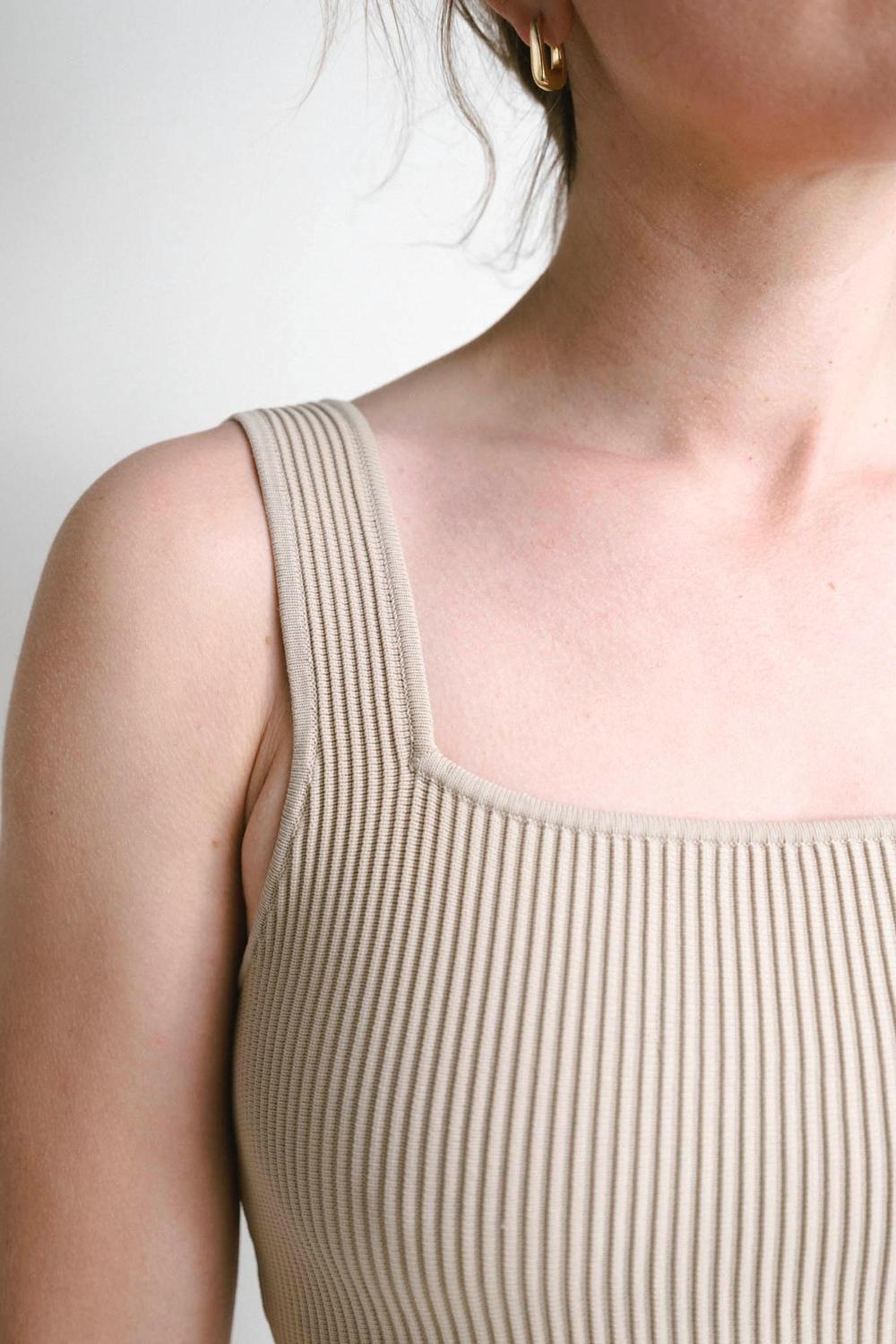 Квадратный вырез. Трикотаж в рубчик по всему изделию. 86% нейлон, 14% спандекс. Ткань тянется.