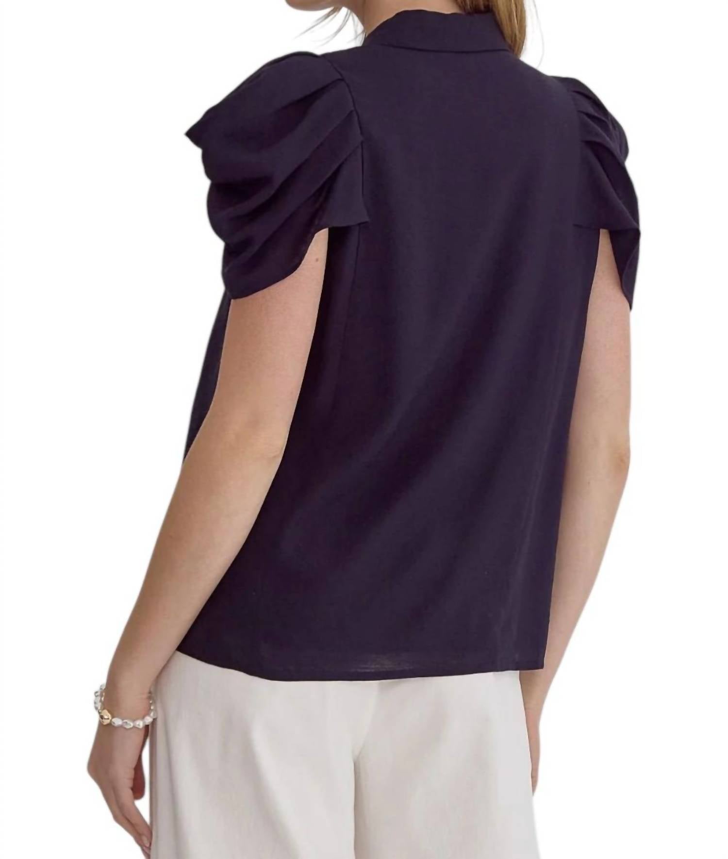 Однотонный фактурный темно-синий топ с короткими рукавами. Имеет собранные драпированные рукава для непринужденного шикарного вида. Изготовлен из легкой и полупрозрачной ткани. Включает практичную застежку на пуговицы для удобства. Классический воротник-стойка подчеркивает его вневременную привлекательность.