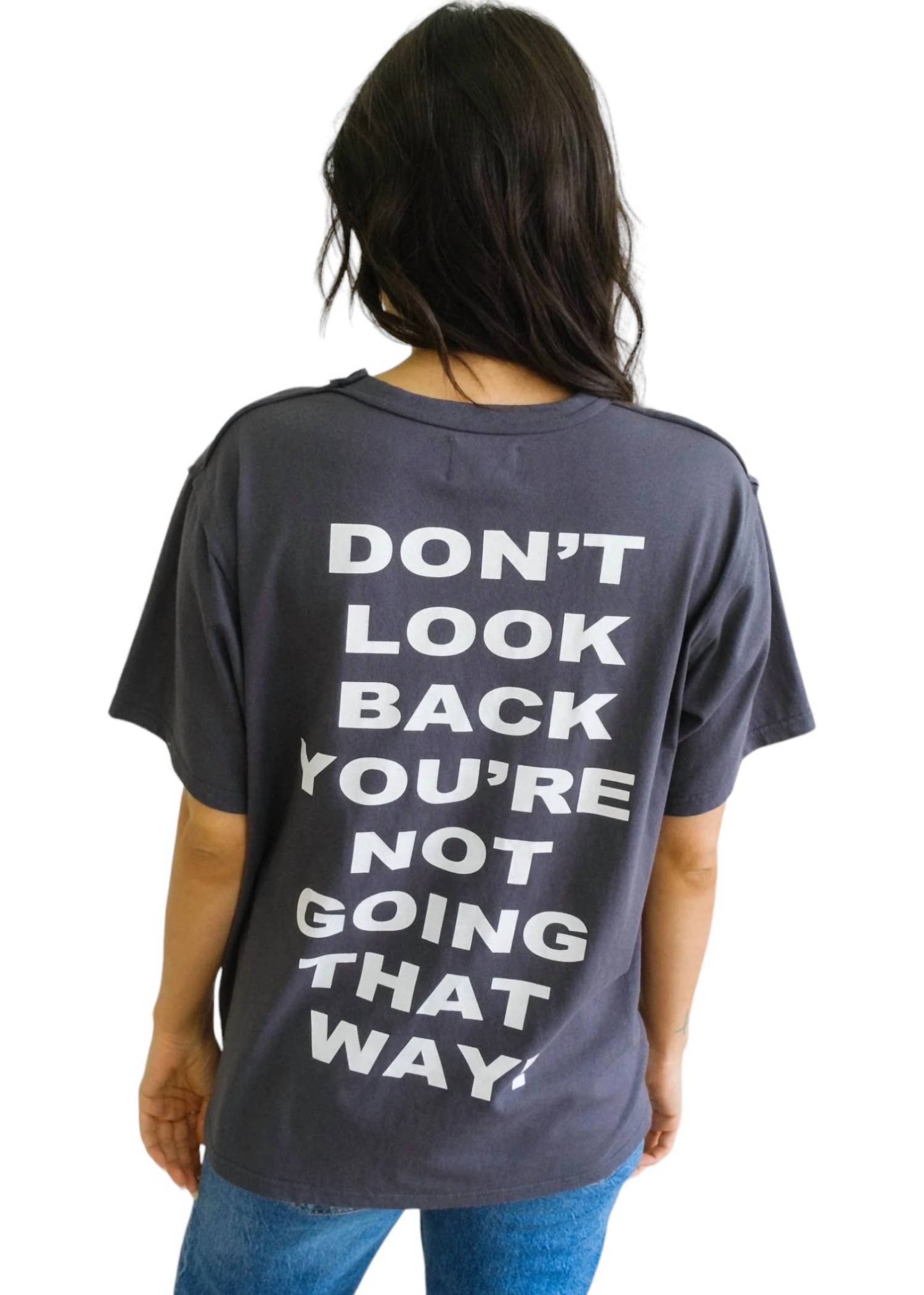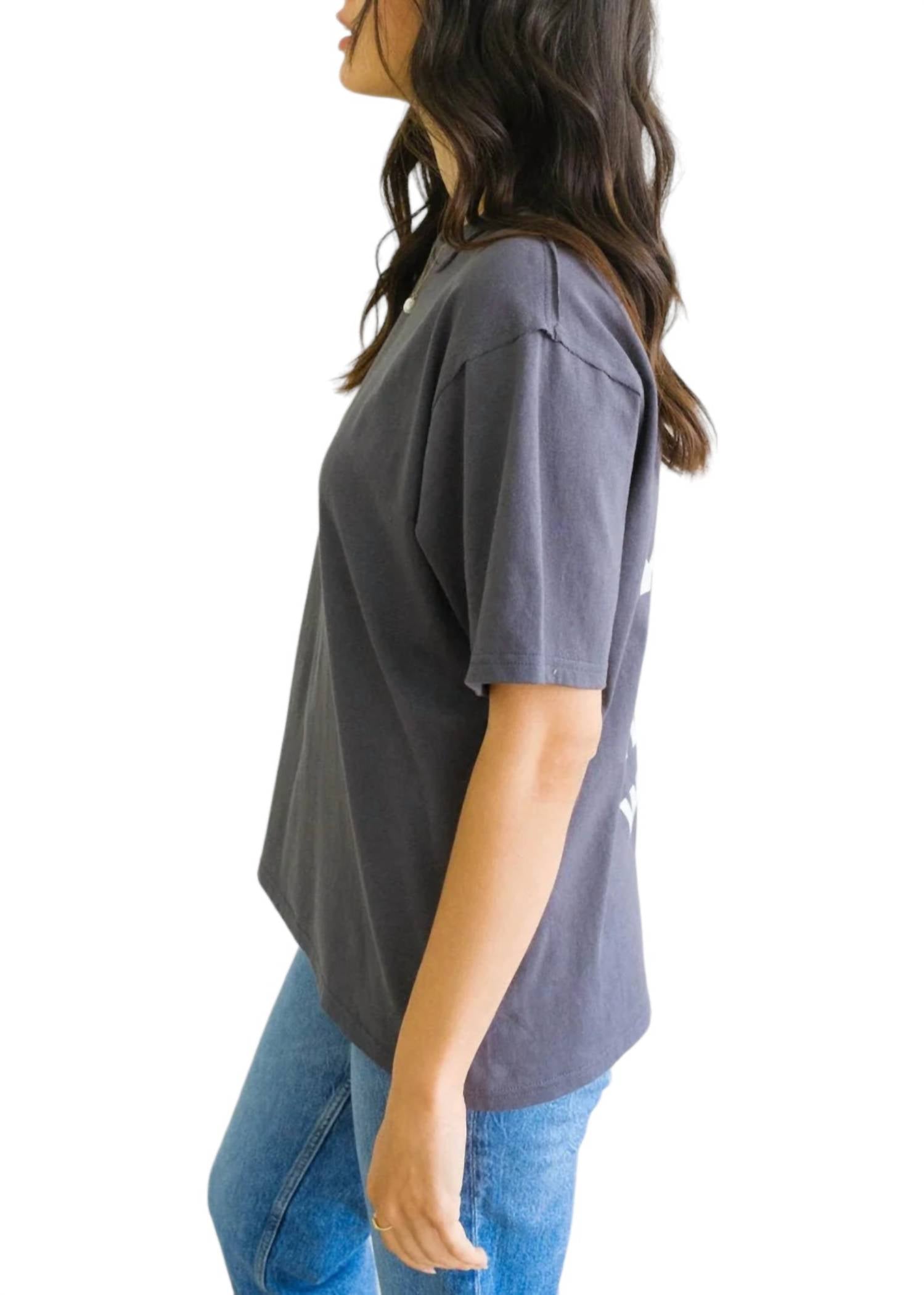 Свободный крой. Круглый вырез горловины. Спущенные плечи. Открытый подол на плече. Крупные белые печатные слова.