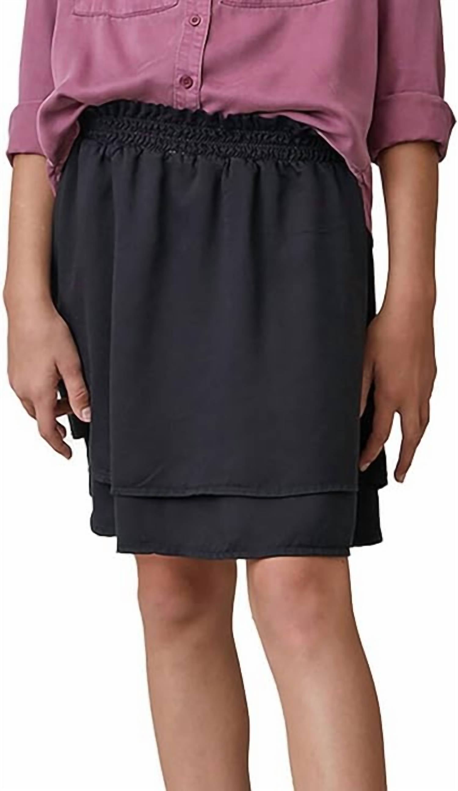 Юбка из атласного Tencel длиной до колена и эластичный пояс со сборками. Расклешенный силуэт. Модель в стиле пуловера. Машинная стирка в холодной воде. 100% Tencel Lyocell. Сделано в Лос-Анджелесе