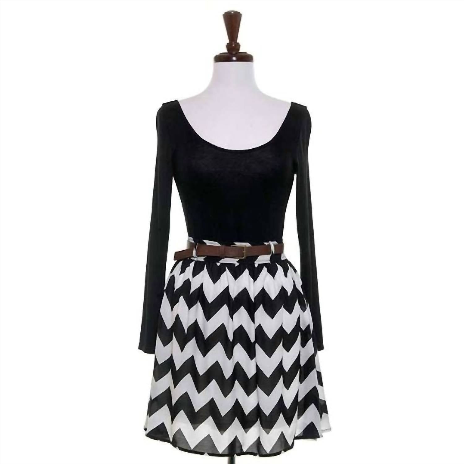 Это платье с длинными рукавами имеет смелый шевронный принт черного и цвета слоновой кости с округлым вырезом-лодочкой, выполнено из эластичной трикотажной ткани. Оно включает в себя шикарный коричневый пояс из кожзаменителя на талии, подчеркивающий его струящийся А-образный крой. Застежка — сдержанная молния сзади.