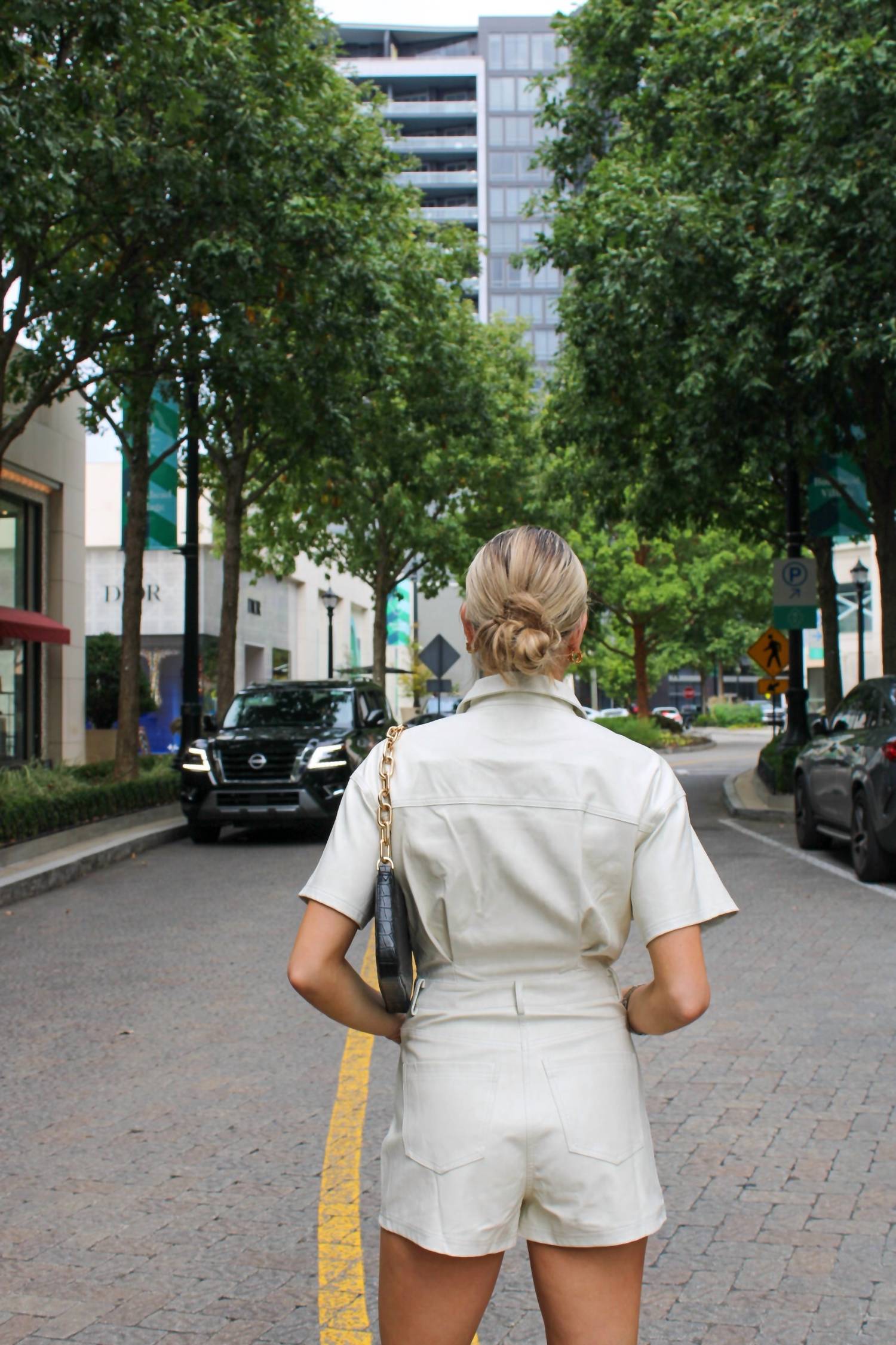 Этот кожаный комбинезон цвета слоновой кости с короткими рукавами имеет воротник-стойку, застежку на пуговицы спереди, нагрудные карманы, шлевки для ремня и боковые карманы.