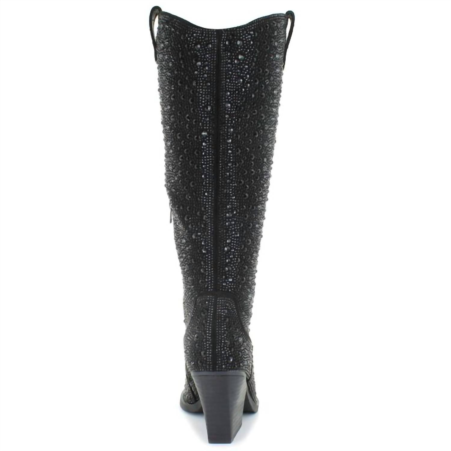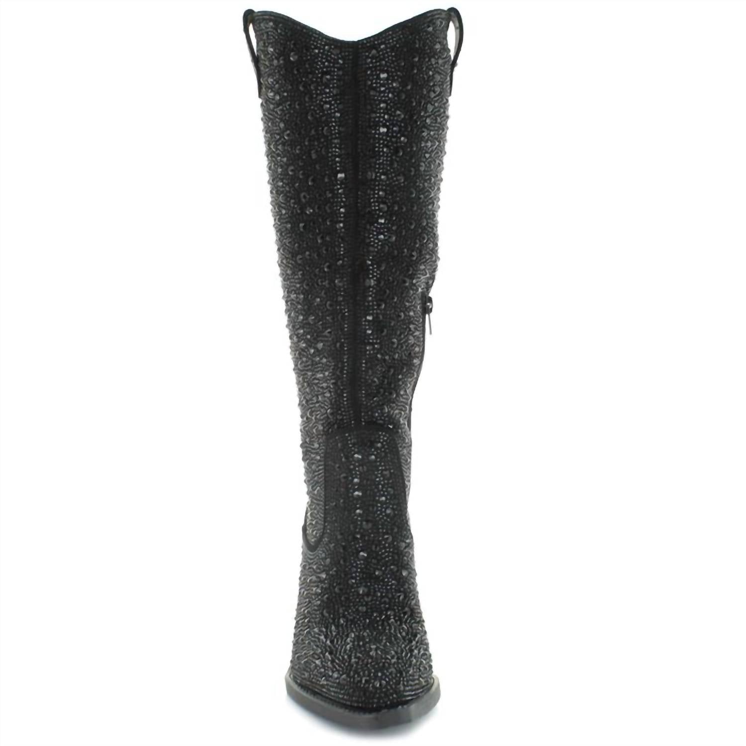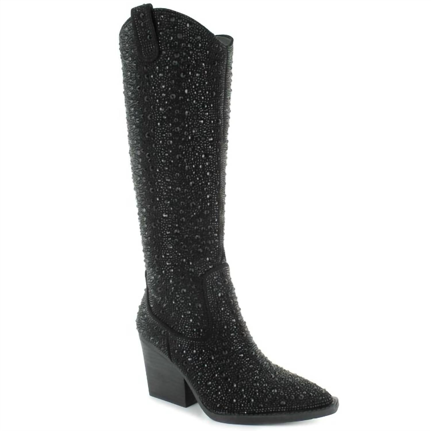 Эти высокие сапоги в стиле вестерн имеют гламурный текстильный верх со стразами по всей поверхности для дополнительного блеска. Они имеют внутреннюю застежку-молнию для легкого надевания и снимания, двойные язычки и мягкую стельку для комфорта. Синтетическая подошва обеспечивает прочность, а 3-дюймовый каблук добавляет стильный подъем.