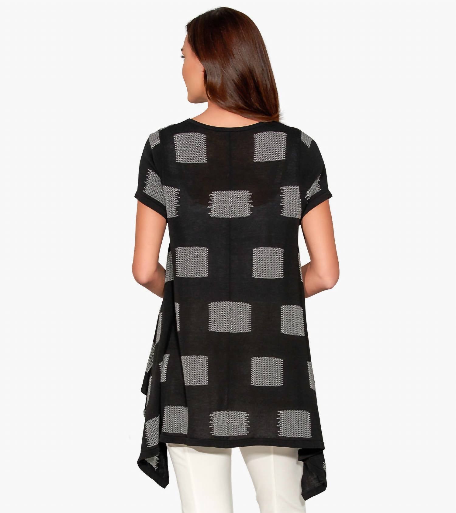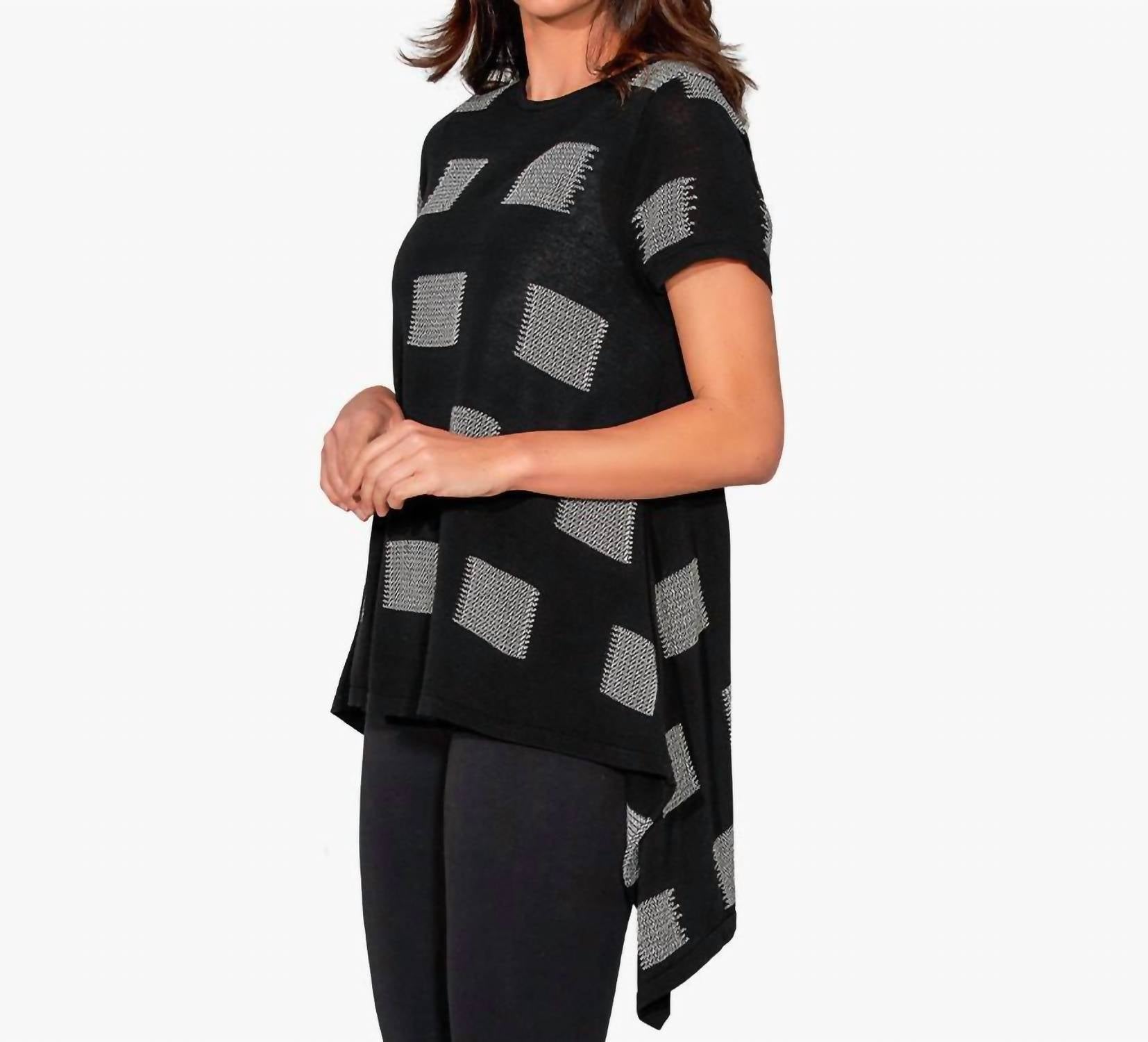 Замысловатые вязаные квадраты, контрастные цвета и привлекательный А-образный крой. Высокий/низкий подол. 75% гребенной хлопок / 25% модал. Импортируется. Ручная стирка и сушка в разложенном виде.