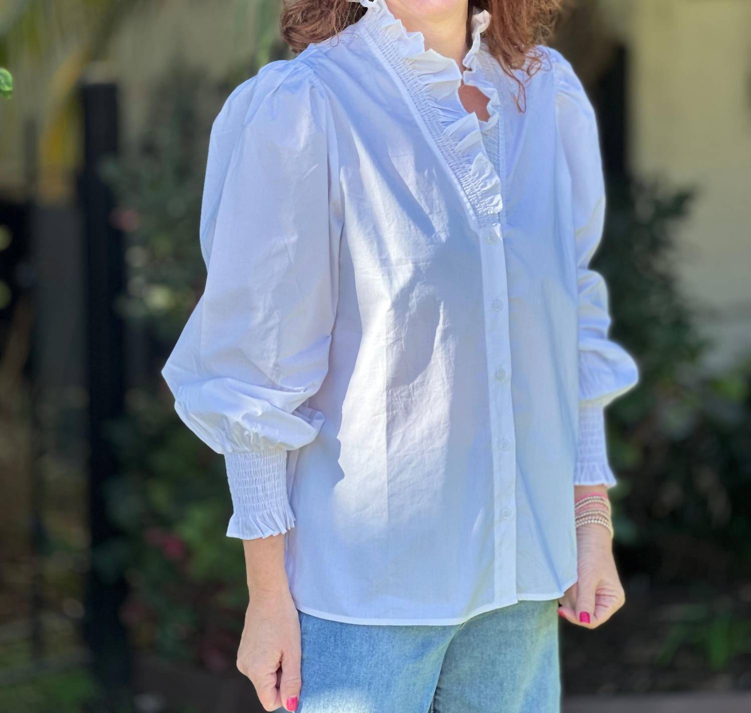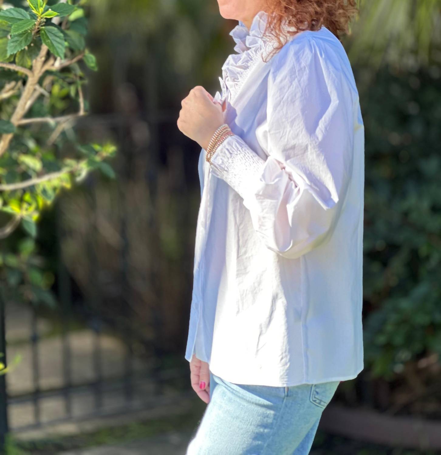 Эта блузка с длинными присборенными рукавами и очаровательным присборенным воротником придает женственный штрих традиционному дизайну. Изготовлена из 100% хлопка, обеспечивает комфорт и воздухопроницаемость. Застежка на пуговицы спереди, с инструкциями по уходу: машинная стирка на щадящем режиме и сушка в разложенном виде.