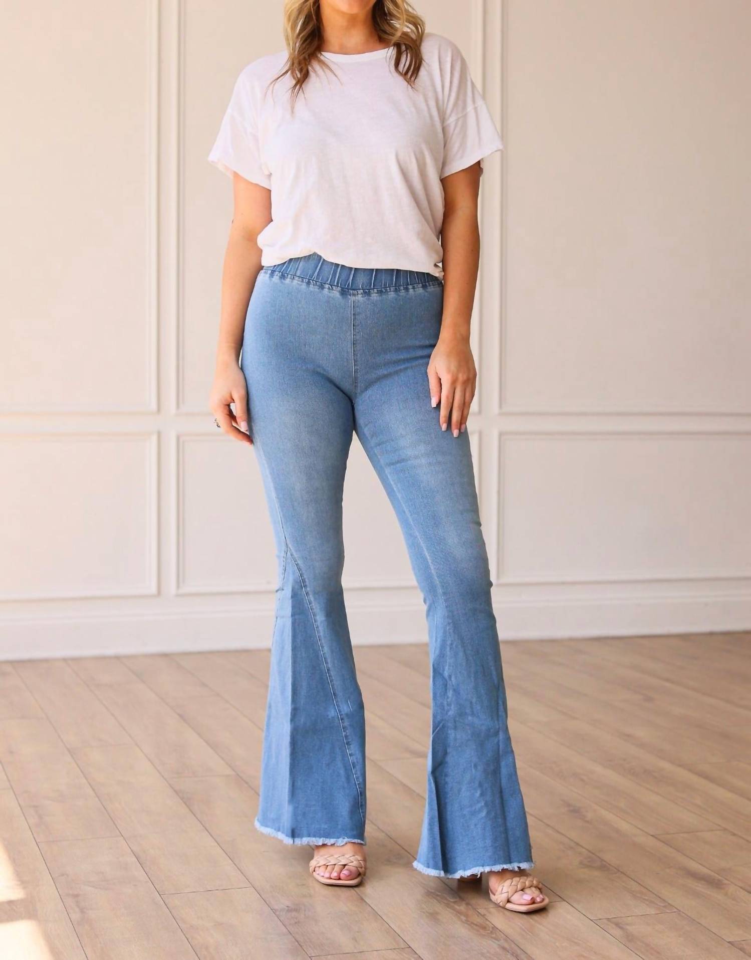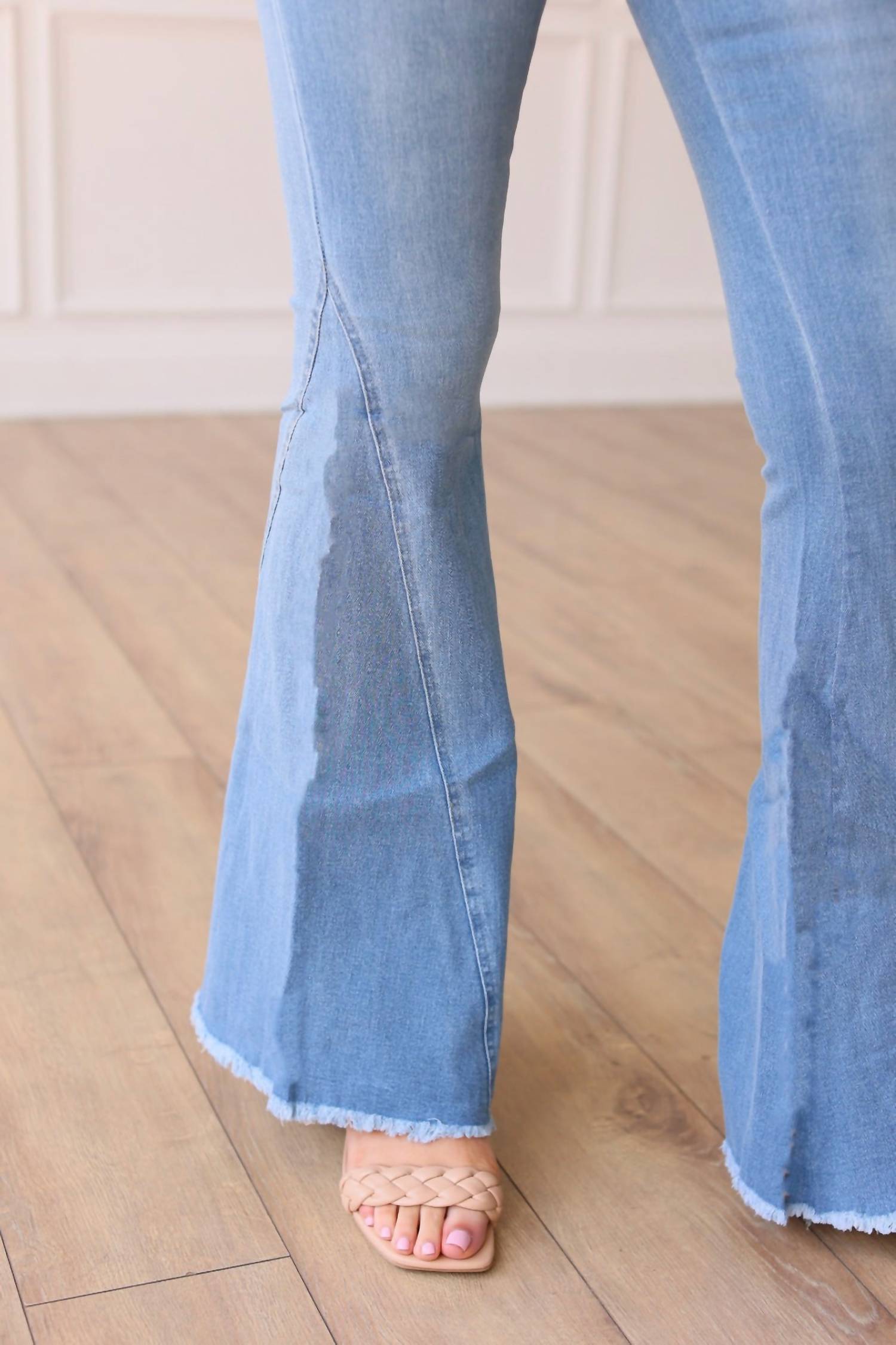 Расклешенный крой — облегающий по бедру и расширяющийся от колена к низу штанины. Эти расклешенные джинсы — идеальный выбор для любого наряда! Высокая посадка и детали на завязках идеально подходят для сочетания с вашим любимым свитером или кардиганом! Наденьте кроссовки, и все готово! Материал — 65% хлопок, 33% полиэстер, 2% спандекс. Внутренний шов — 33 1/2". Посадка — соответствует размеру
