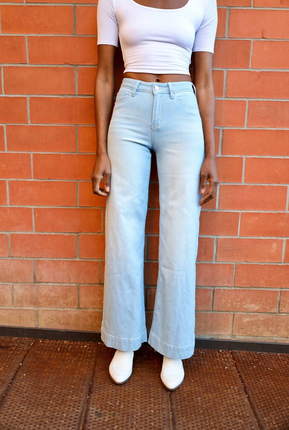 Расклешенный крой. Высокая посадка. Широкие штанины. Джинсы фасона «труба». Создают фигуру «песочные часы». Плотно облегают до колена и ниже. Прямые до щиколотки. Пять карманов. Застежка на одну пуговицу. Молния спереди. Шлевки для ремня. Внутренний шов 34 дюйма. Посадка 10,75 дюйма. Ширина брючин 23,5 дюйма. 75% хлопок. 23% спандекс. 1% вискоза. 1% спандекс. Машинная стирка в холодной воде.