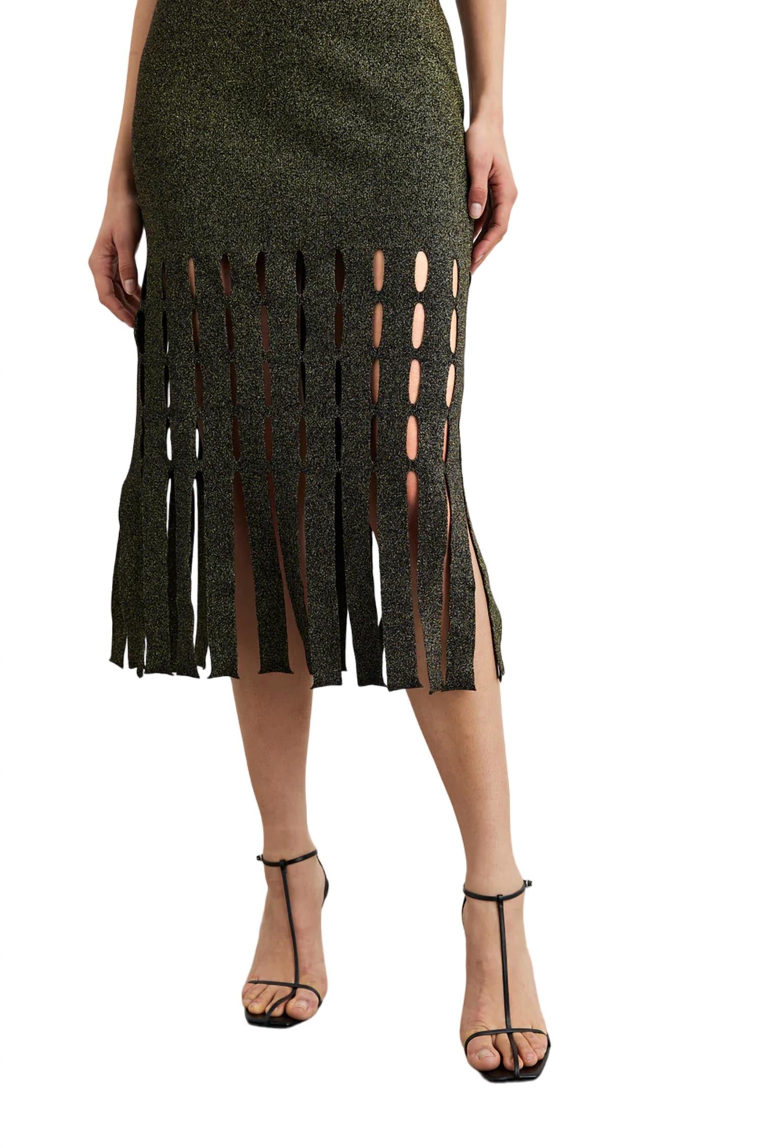 Это платье миди облегающего кроя с уникальными вырезами, которые элегантно ниспадают на ноги. Высокий V-образный вырез. Без рукавов. Оно соответствует размеру, изготовлено из 100% люрекса, длина 49 дюймов (от размера Small). Только сухая чистка. Импортное.