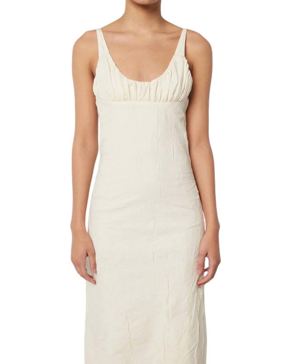 Это платье миди с глубоким вырезом на груди, широкими бретелями, юбкой А-силуэта и открытой молнией по центру спины. Спроектировано с глубоким вырезом-лодочкой и намеренно потрепанным необработанным краем. Изготовлено из 51% полиэстера и 49% хлопка. Машинная стирка в холодной воде.