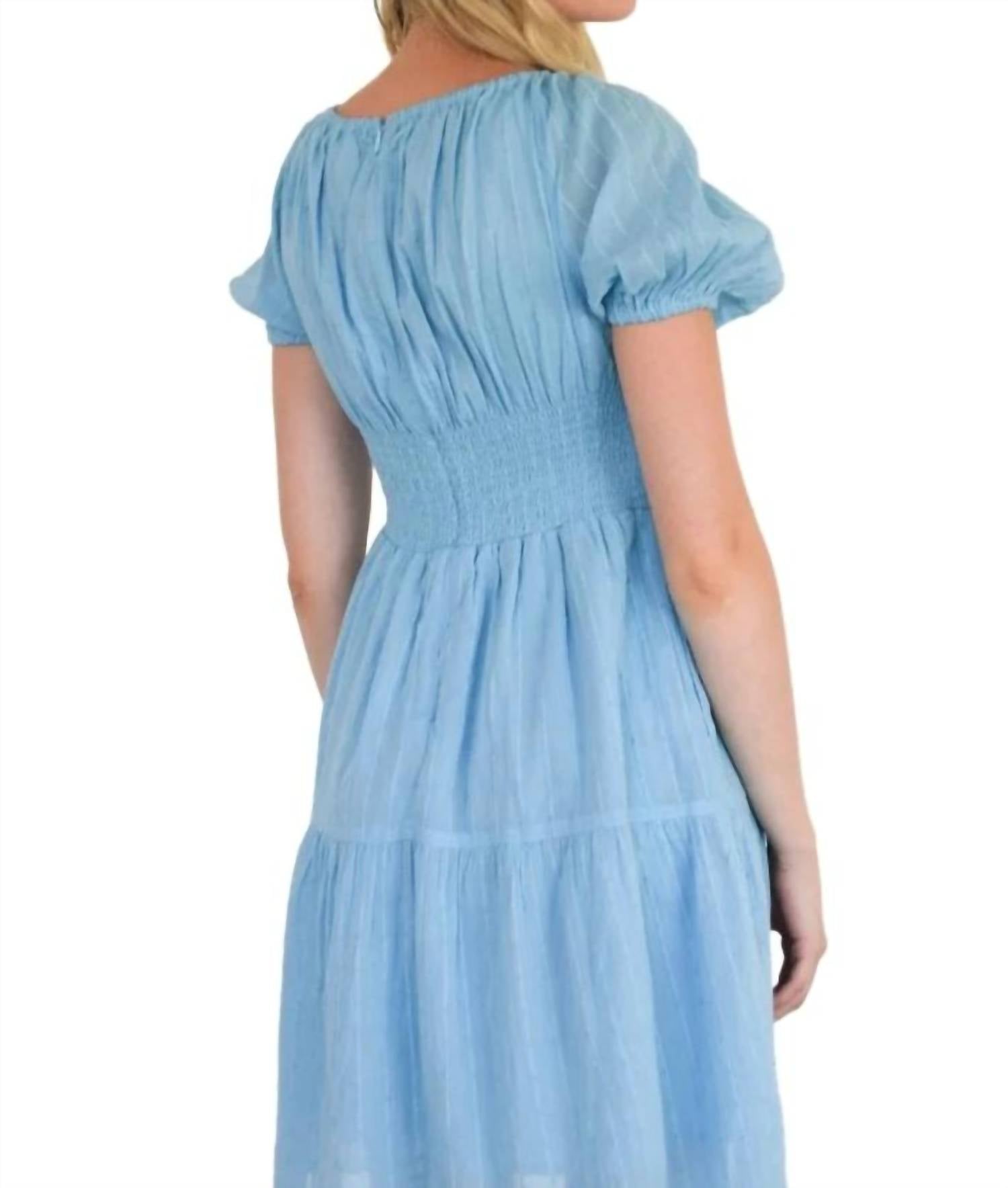 Элегантное мини-платье А-силуэта воздушного голубого цвета. Сшитое с лифом с V-образным вырезом, который неотразимо льстит. Имеет короткие рукава-фонарики. Игривая многоярусная юбка с оборками, достигающая стильной длины до середины бедра. Застежка простая, с застежкой-липучкой. Легкое сочетание комфорта и шикарной изысканности.