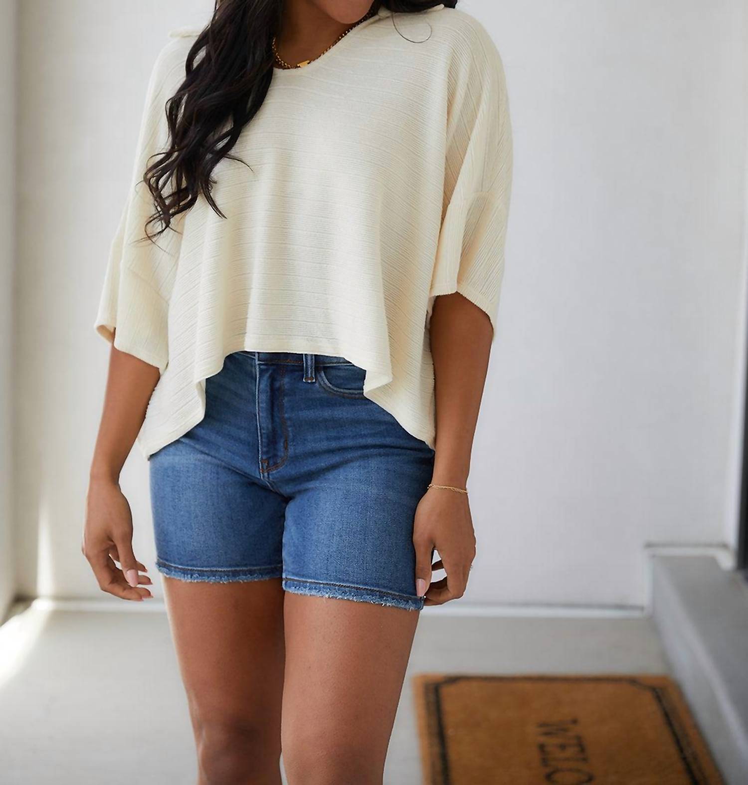 Текстурированная трикотажная полоска. Отложной воротник. Спущенное плечо. Настоящий кроп. Свободный силуэт. 52% полиэстер, 46% вискоза, 2% спандекс. Соответствует размеру.