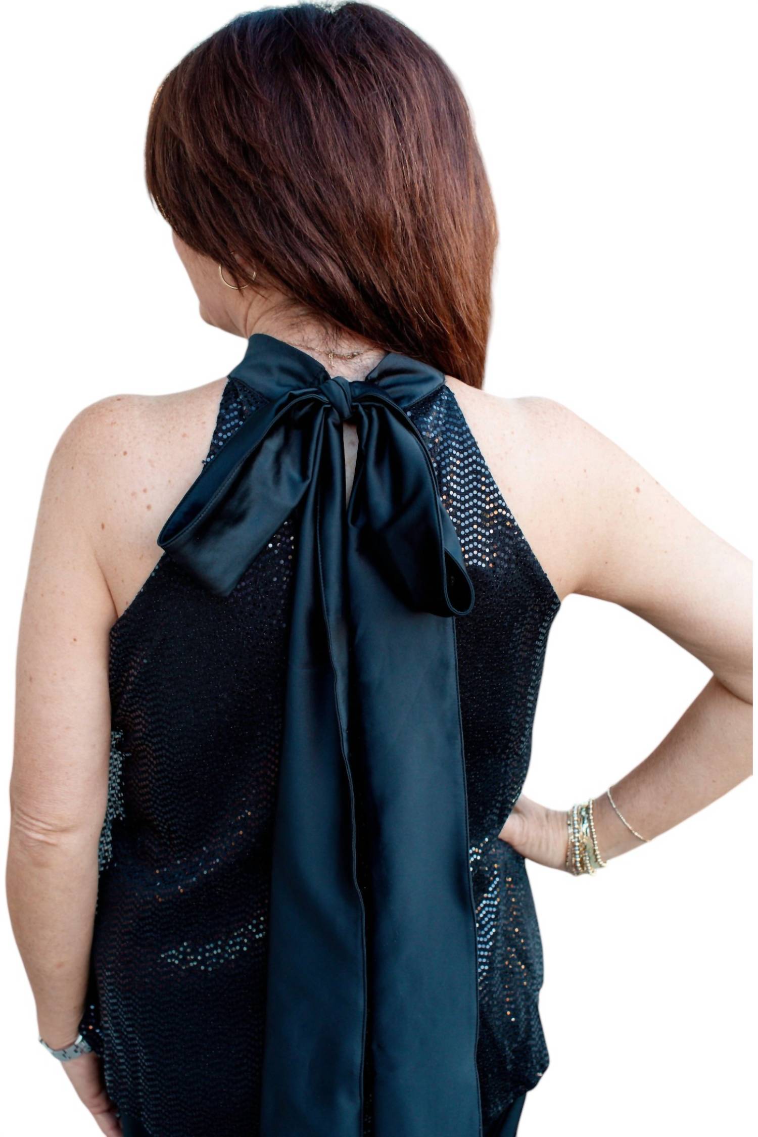 Вечерняя ослепительная блузка без рукавов классического черного цвета. Шикарный вырез-халтер и завязка на спине для элегантного силуэта. Создана, чтобы блистать. Удобная посадка благодаря подкладке и эффектному узорчатому дизайну. Ухаживать за этой эффектной вещью легко, стирая вручную по мере необходимости.