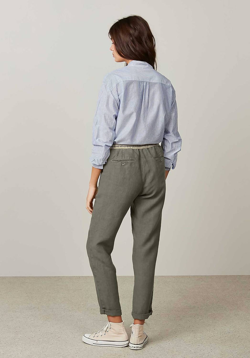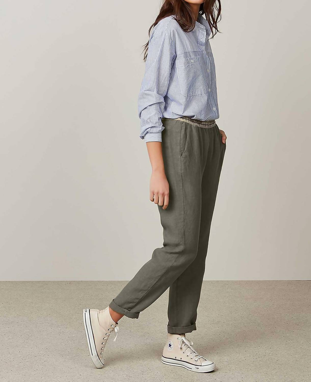 Брюки средней посадки с золотистой резинкой, итальянские карманы по бокам и прорезные карманы с пуговицами сзади. Льняная ткань из Франции, легкая, текстурированная, дышащая и удобная в носке. Окрашенный в готовом виде продукт, который обеспечивает легкий выцветший цвет. Сделано в Марокко. Размеры - 0/XS 1/S 2/M 3/L 4/XL