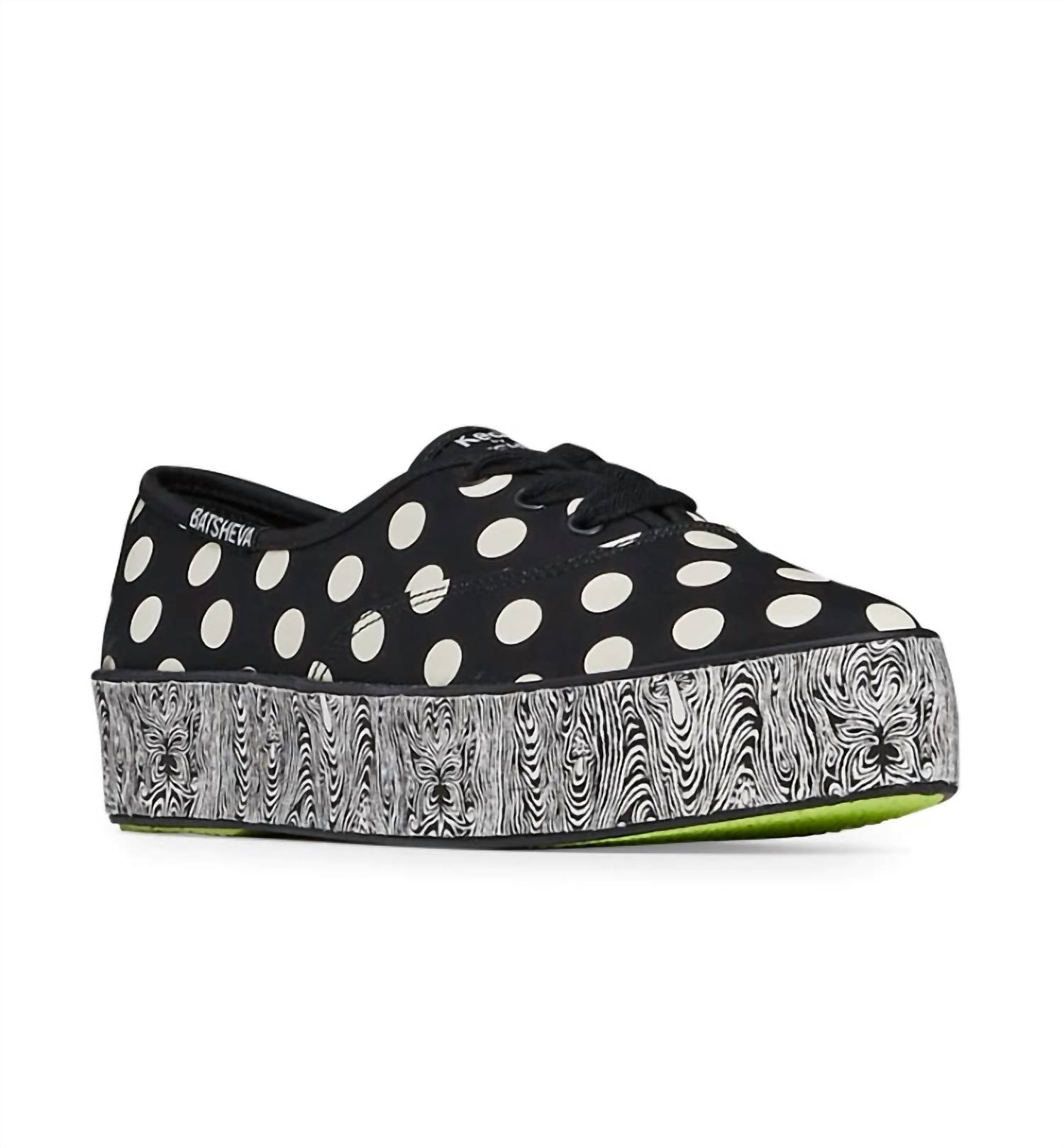 Кроссовки на платформе с полированным острым носком. Индивидуальные принты с ярким цветом и текстурой в стиле ретро. Яркая зеленая сетка, вышитый узор в горошек. Точечная текстура на резиновой вставке. Сочетают высоту каблука, удобство кроссовок и шикарную эстетику остроносых лодочек.