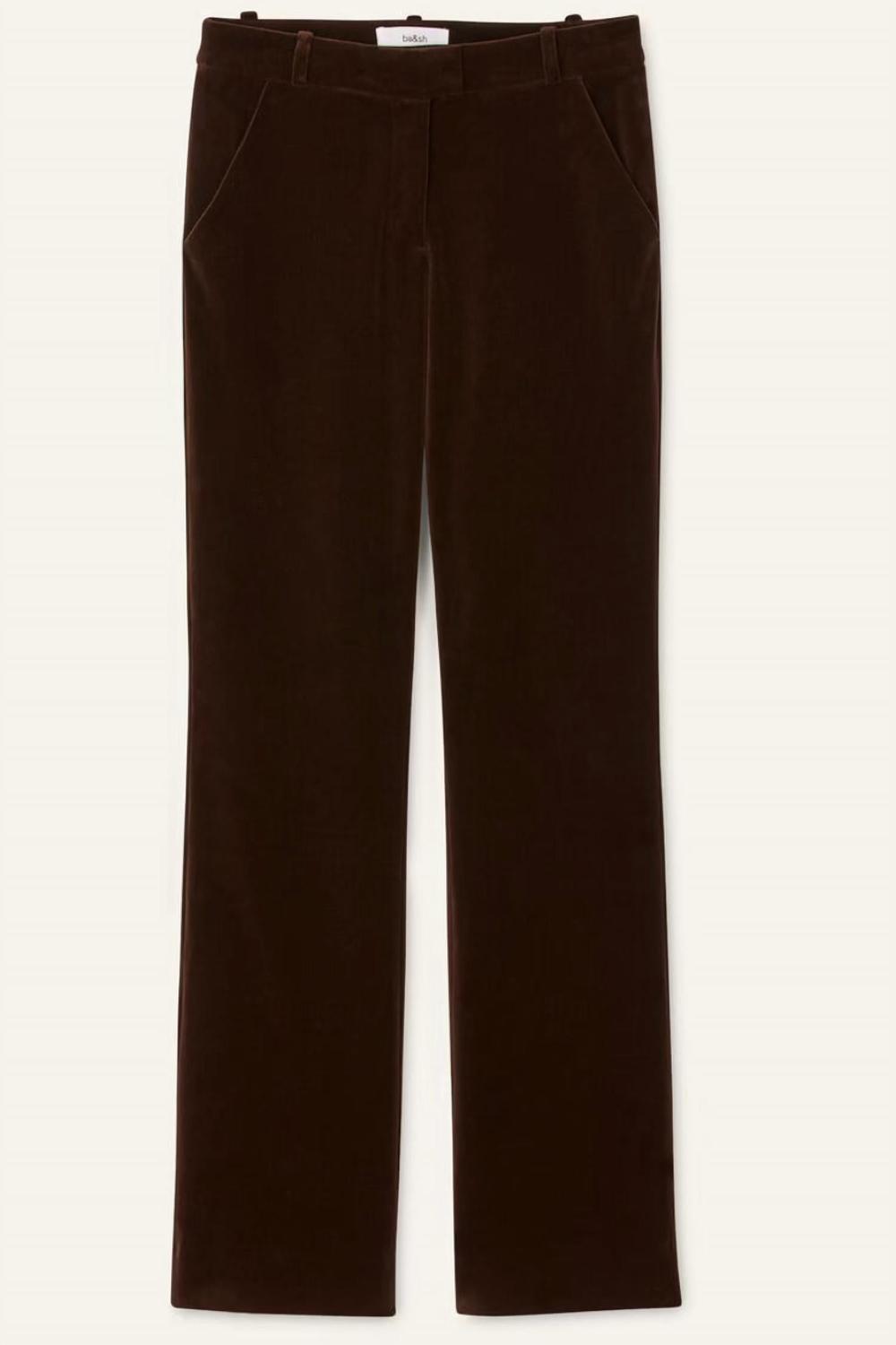 Изготовленные из гладкого бархата, эти брюки могут похвастаться составом 98% хлопка и 2% эластана, что обеспечивает комфорт и выгодную посадку. Сделаны в Болгарии, имеют среднюю посадку на талии со складками спереди, косые карманы, карманы с кантом сзади и скрытые пуговицы. Застегиваются на молнию. Химчистка.