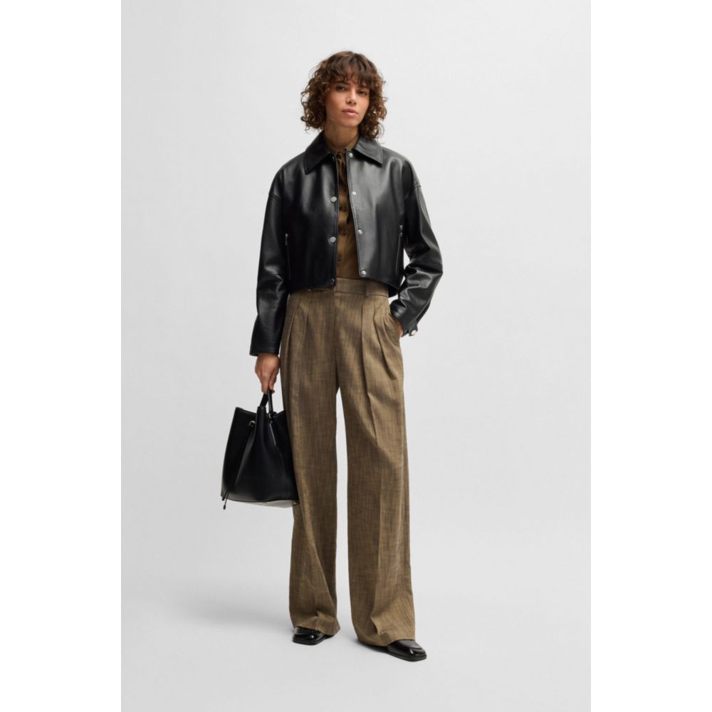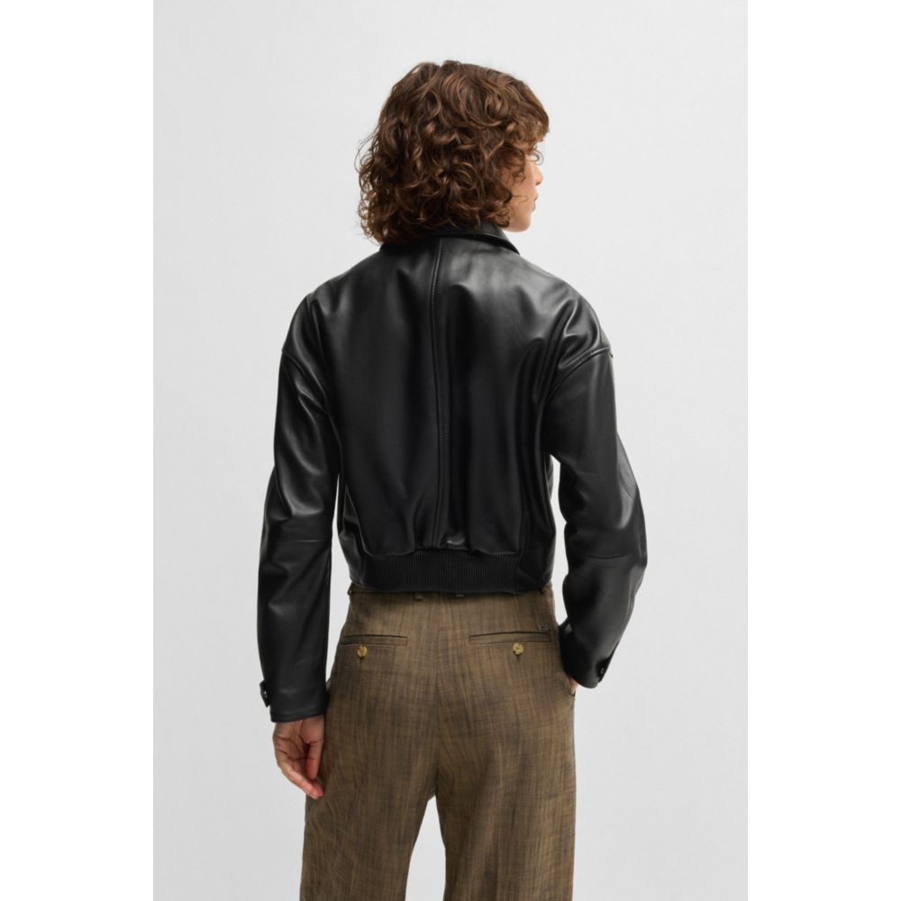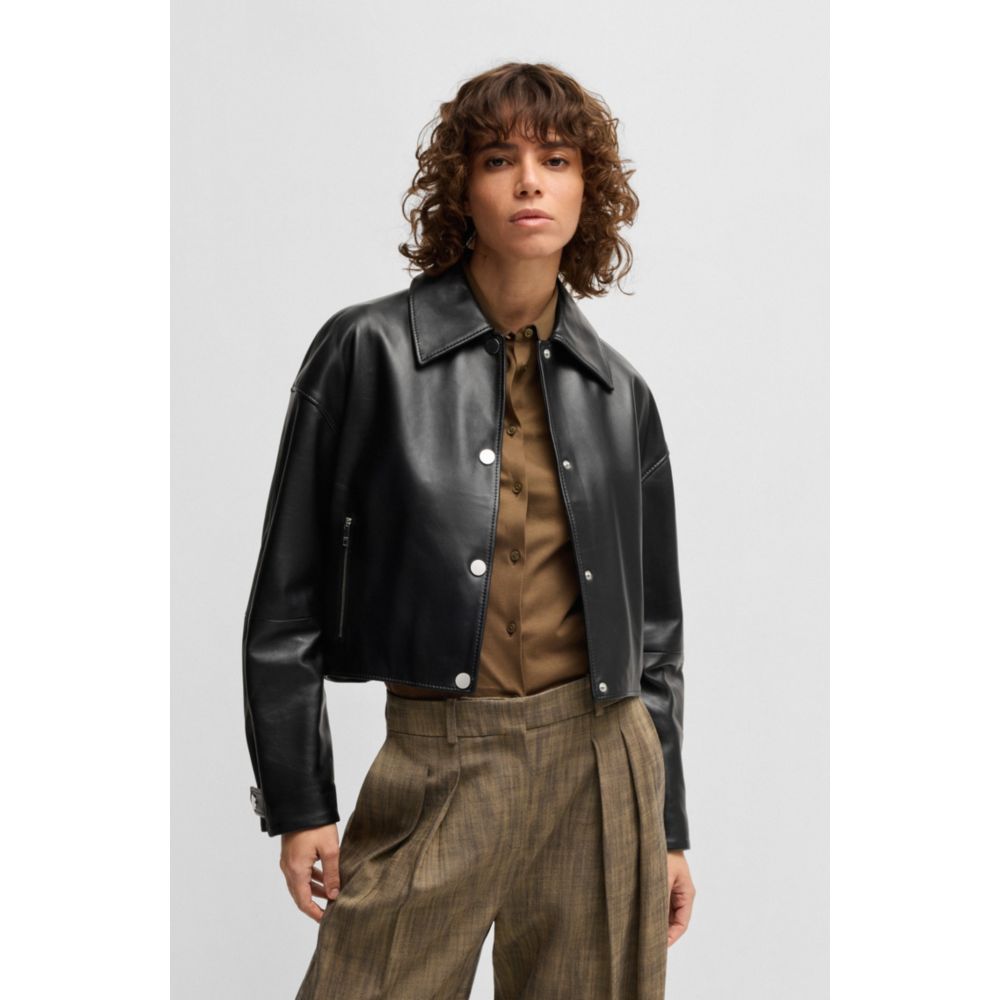 Современная кожаная куртка от BOSS Womenswear, украшенная закрытыми кнопками и эластичным подолом сзади. Этот укороченный фасон отличается блестящей отделкой.
