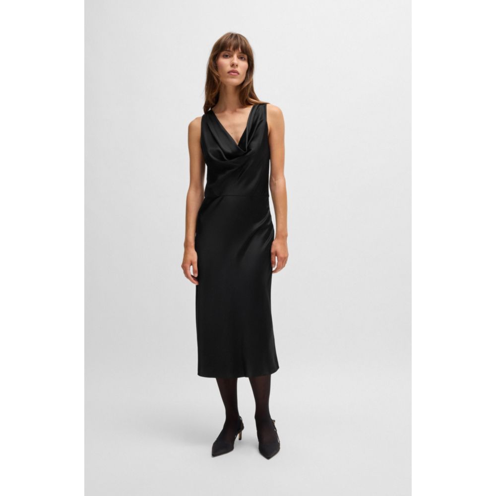 Современное платье без рукавов от BOSS. Это женственное изделие выполнено из струящегося атласа с драпированным вырезом-хомутиком.