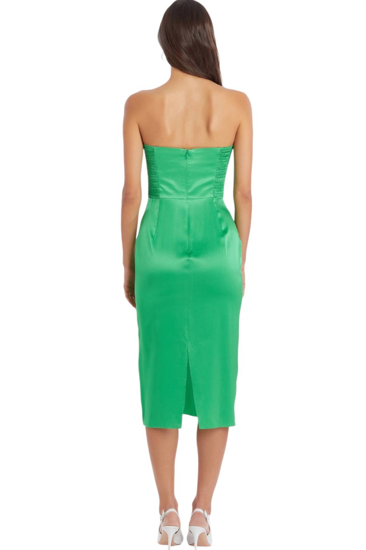 Это платье миди без бретелек сочетает в себе женственность и очарование с контрастной деталью бюстгальтера в форме сердечка и лифом А-силуэта. Сборки сбоку сзади обеспечивают стройную посадку, а разрез по центру сзади добавляет нотку очарования. Имеет невидимую молнию и не имеет подкладки. Изготовлено из 100% шелка. Только сухая чистка.