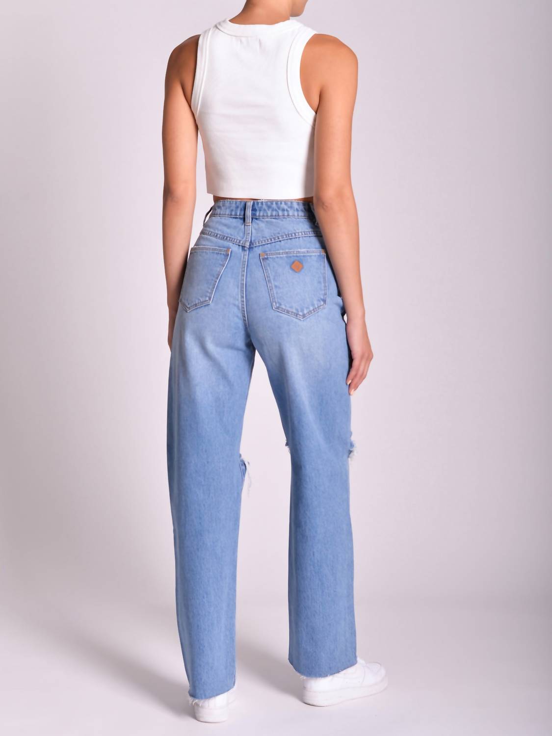 Джинсы с высокой талией цвета Vintage Blue. Изготовлены из переработанных материалов. Не тянутся. Большие рваные детали на обоих коленях. Мешковатые в штанинах; присборены на щиколотках. Машинная стирка в холодной воде. 100% хлопок.