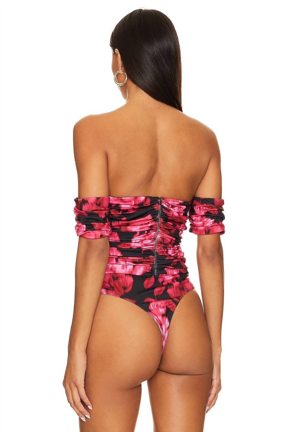 Застежка на кнопки с застежкой-стрингом сзади. Скрытая застежка-молния сзади. V-образный вырез спереди. Драпированный фасон с открытыми плечами. Трикотажная ткань со сборками. Основная часть - 90% полиэстер, 10% спандекс; Подкладка - 87% полиэстер, 13% спандекс. Сделано в Китае. Только сухая чистка.