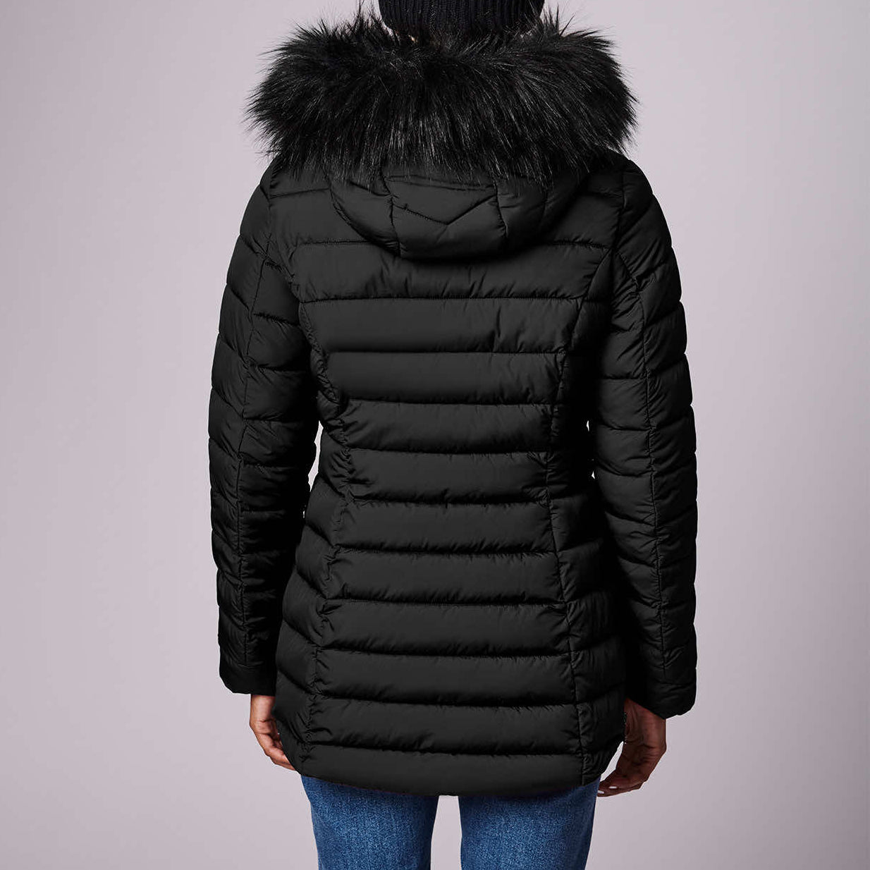 Стеганая куртка-пуховик с капюшоном, отделанным мехом, из 100% переработанного полиэстера. Потайная застежка-молния, карманы на молнии, вертикальная строчка сверху, высокий-низкий подол, шлицы на молнии и манжеты рукавов с резинкой внутри. Перед стиркой снимите искусственный мех. Стирайте в машине в холодной воде с тканями похожих цветов, деликатный режим.