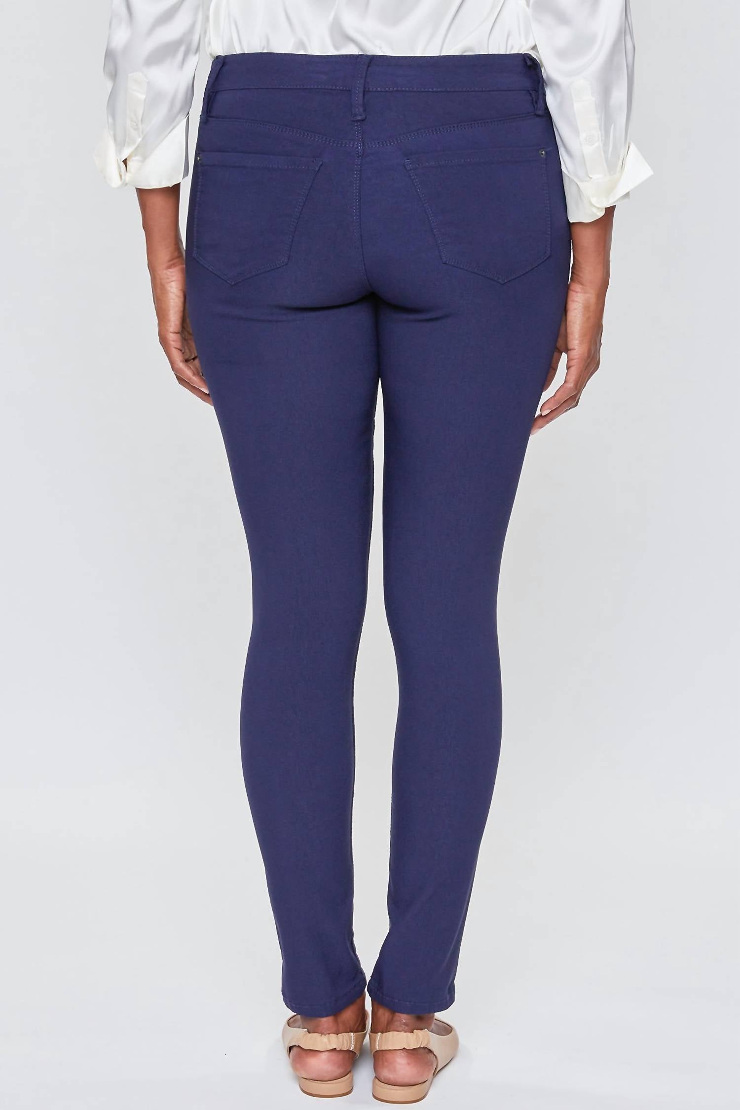 Застежка на одну пуговицу, молния спереди и шлевки для ремня. Имитация карманов спереди. 70% хлопок/ 26% нейлон/ 4% спандекс.