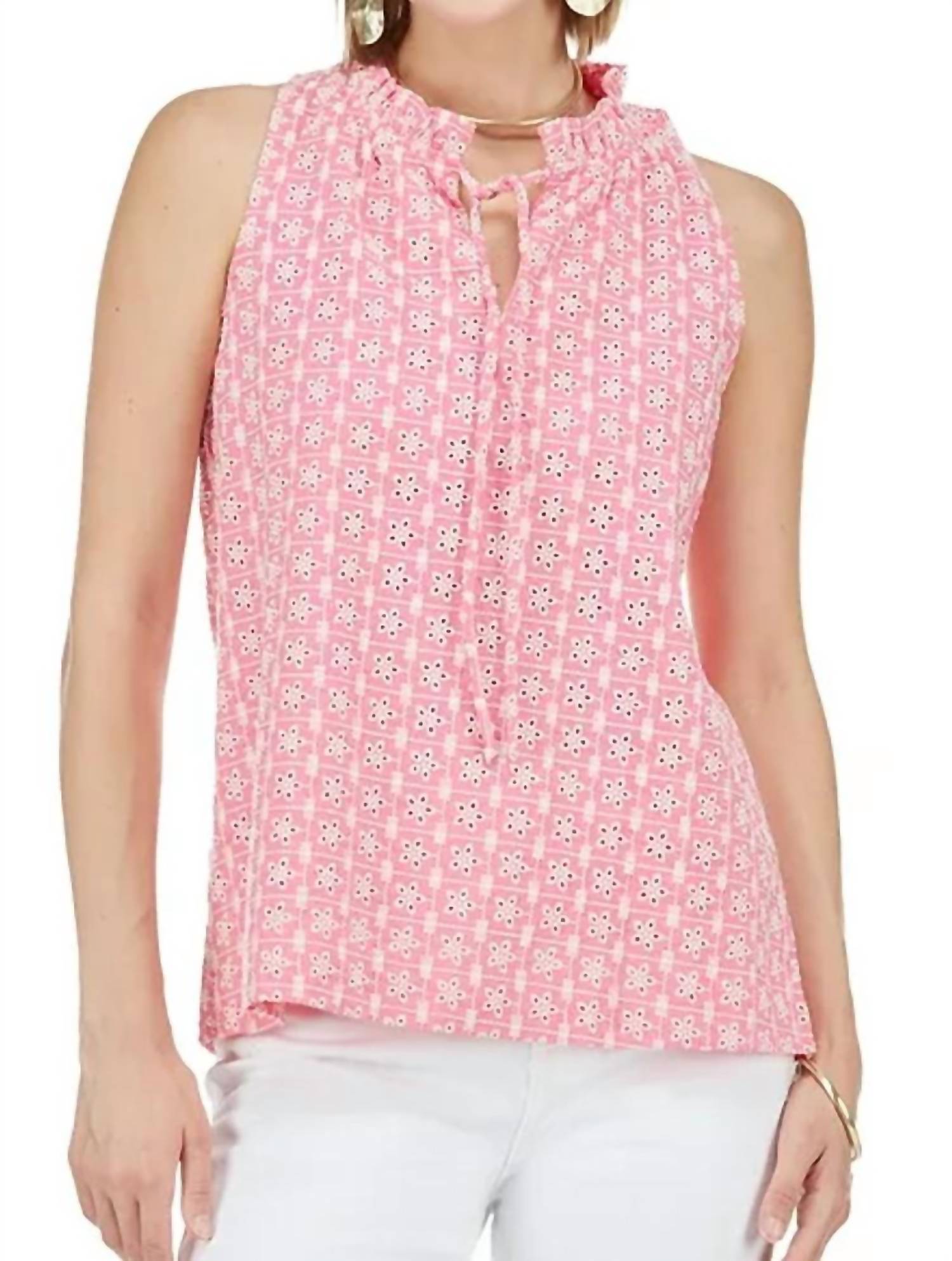 Универсальная блузка, которая подойдет и для работы, и для ужина! Имеет присборенный воротник с завязкой и безрукавный дизайн, подчеркнутый изящной отделкой люверсами. Изготовлена ​​из 100% хлопка и полностью на подкладке, соответствует размеру для удобного и стильного вида.